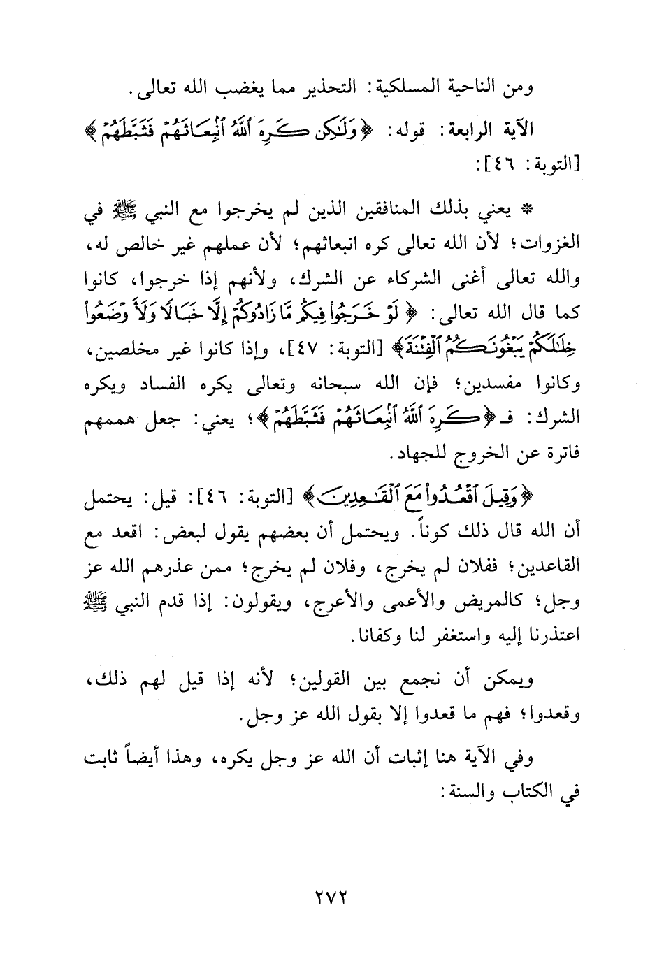 الآية الرابعة: قوله: {وَلَكِنْ كَرِهَ اللَّهُ انْبِعَاثَهُمْ فَثَبَّطَهُمْ} [التوبة: 46].