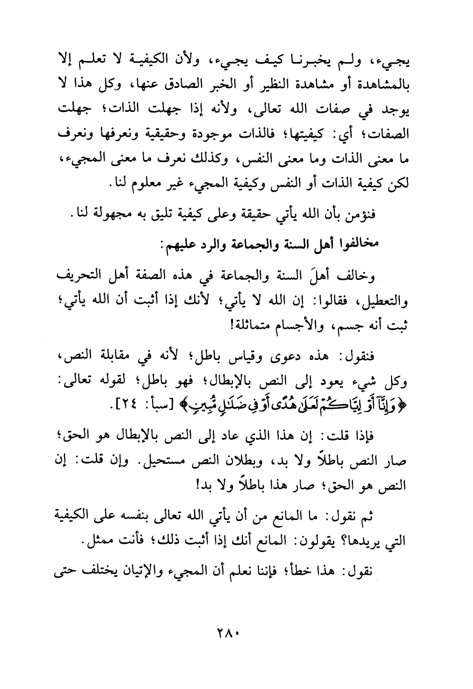 يجيء، ولم يخبرنا كيف يجيء، ولأن الكيفية لا تعلم إلا بالمشاهدة أو مشاهدة النظير أو الخبر الصادق عنها، وكل هذا لا يوجد في صفات الله تعالى، ولأنه إذا جهلت الذات، جهلت الصفات، أي: كيفيتها، فالذات موجودة وحقيقية ونعرفها ونعرف ما معنى الذات وما معنى الذات وما معنى النفس، وكذلك نعرف ما معنى المجيء، لكن كيفية الذات أو النفس وكيفية المجيء غير معلوم لنا.