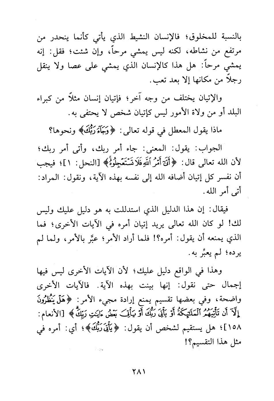 وهذا في الواقع دليل عليك، لأن الآيات الأخرى ليس فيها إجمال حتى نقول: إنها بينت بهذه الآية. فالآيات الأخرى واضحة، وفي بعضها تقسيم يمنع إرادة مجيء الأمر: {هَلْ يَنْظُرُونَ إِلاّ أَنْ تَأْتِيَهُمُ الْمَلائِكَةُ أَوْ يَأْتِيَ رَبُّكَ أَوْ يَأْتِيَ بَعْضُ آيَاتِ رَبِّكَ} [الأنعام: 158]؛ هل يستقيم لشخص أن يقول: {يَأْتِيَ رَبُّكَ}، أي: أمره في مثل هذا التقسيم؟!
