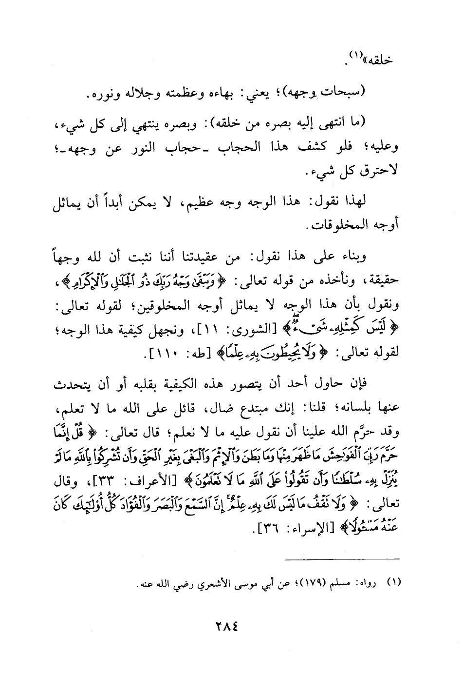 وبناء على هذا نقول: من عقيدتنا أننا نثبت أن لله وجهاً حقيقة، ونأخذه من قوله: {وَيَبْقَى وَجْهُ رَبِّكَ ذُو الْجَلالِ وَالأِكْرَامِ}، ونقول بأن هذا الوجه لا يماثل أوجه المخلوقين، لقوله تعالى: {لَيْسَ كَمِثْلِهِ شَيْءٌ} [الشورى: 11]، ونجهل كيفية هذا الوجه، لقوله تعالى: {وَلا يُحِيطُونَ بِهِ عِلْماً} [طه: 110].