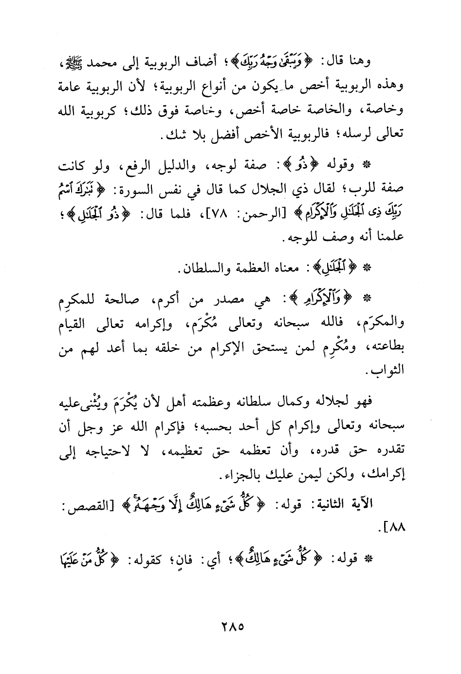 وهنا قال: {وَيَبْقَى وَجْهُ رَبِّكَ}، أضاف الربوبية إلى محمد صلى الله عليه وسلم، وهذه الربوبية أخص ما يكون من أنواع الربوبية، لأن الربوبية عامة وخاصة، والخاصة خاصة أخص، وخاص فوق ذلك، كربوبية الله تعالى لرسله، فالربوبية الأخص أفضل بلا شك.