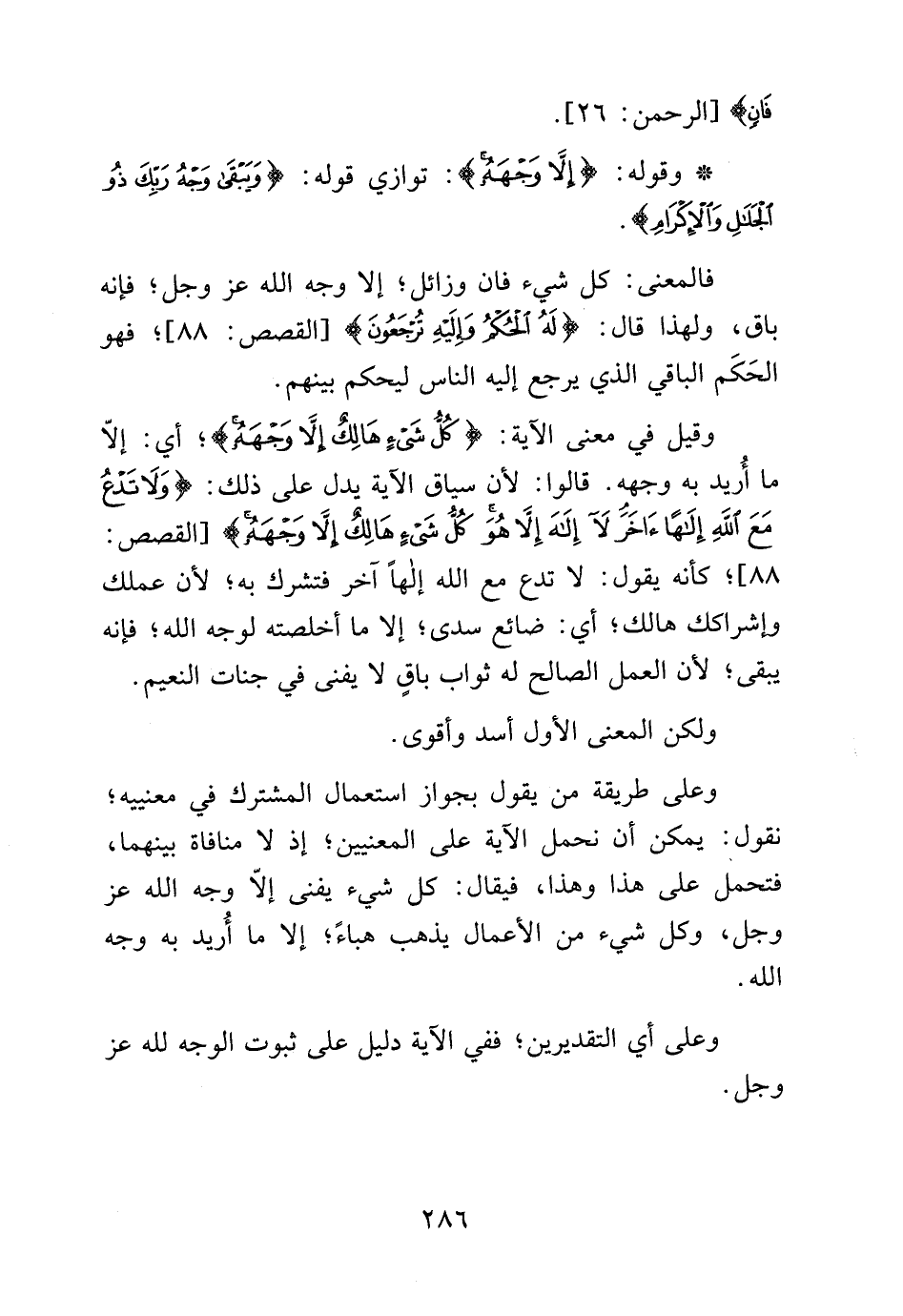 وعلى طريقة من يقول بجواز استعمال المشترك في معنييه، نقول: يمكن أن نحمل الآية على المعنيين، إذ لا منافاة بينهما، فتحمل على هذا وهذا، فيقال: كل شيء يفنى إلا وجه الله عز وجل، وكل شيء من الأعمال يذهب هباء، إلا ما أريد به وجه الله.
