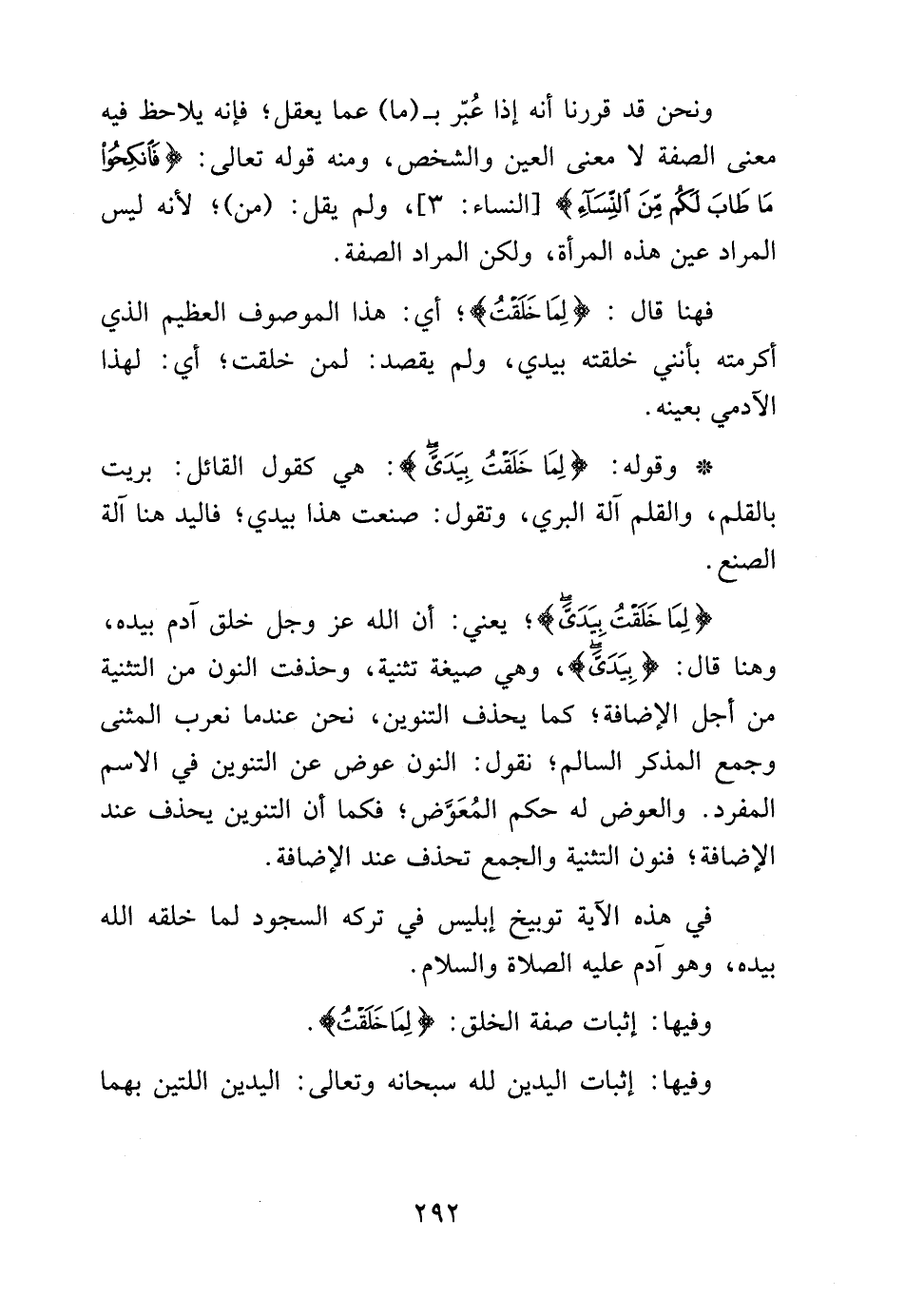 {لِمَا خَلَقْتُ بِيَدَيَّ}، يعني: أن الله عز وجل خلق آدم بيده، وهنا قال: {بِيَدَيَّ}، وهي صيغة تثنية، وحذفت النون من التثنية من أجل الإضافة، كما يحذف التنوين، نحن عندما نعرب المثنى وجمع المذكر السالم، نقول: النون عوض من التنوين في الاسم المفرد. والعوض له حكم المعوض، فكما أن التنوين يحذف عند الإضافة، فنون التثنية والجمع تحذف عند الإضافة.
