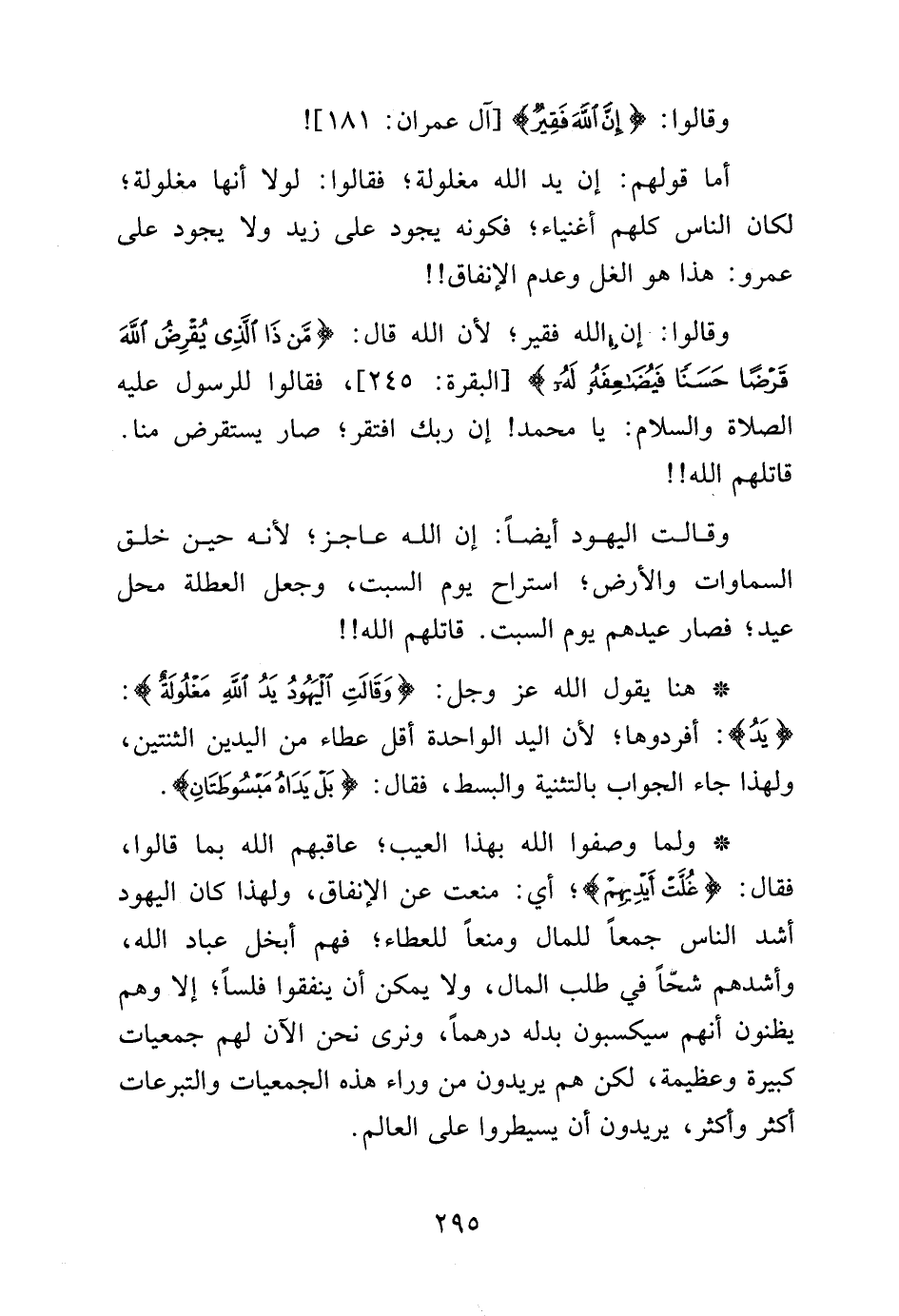 هنا يقول الله عز وجل: {وَقَالَتِ الْيَهُودُ يَدُ اللَّهِ مَغْلُولَةٌ}: {يَدُ}: أفردوها، لأن اليد الواحد أقل عطاء من اليدين الثنتين، ولهذا جاء الجواب بالتثنية والبسط، فقال: {بَلْ يَدَاهُ مَبْسُوطَتَانِ}.
