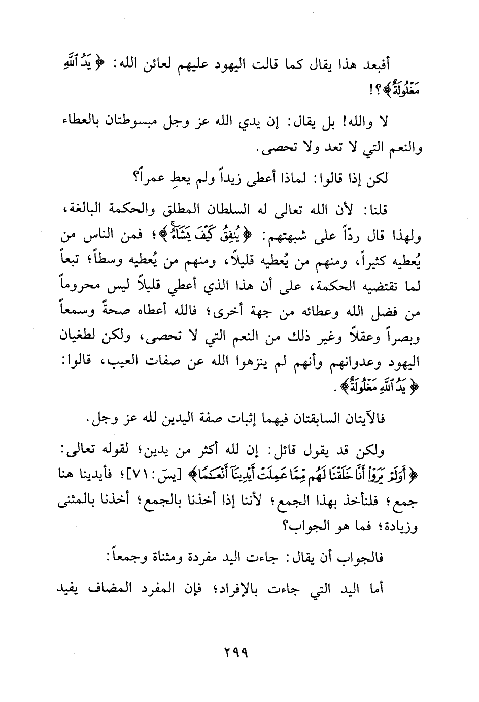 ولكن قد يقول قائل: إن لله أكثر من يدين، لقوله تعالى: {أَوَلَمْ يَرَوْا أَنَّا خَلَقْنَا لَهُمْ مِمَّا عَمِلَتْ أَيْدِينَا أَنْعَاماً} [يس: 71]، فأيدينا هنا جمع، فلنأخذ بهذا الجمع، لأننا إذا أخذنا بالجمع، أخذنا بالمثنى وزيادة، فما هو الجواب؟