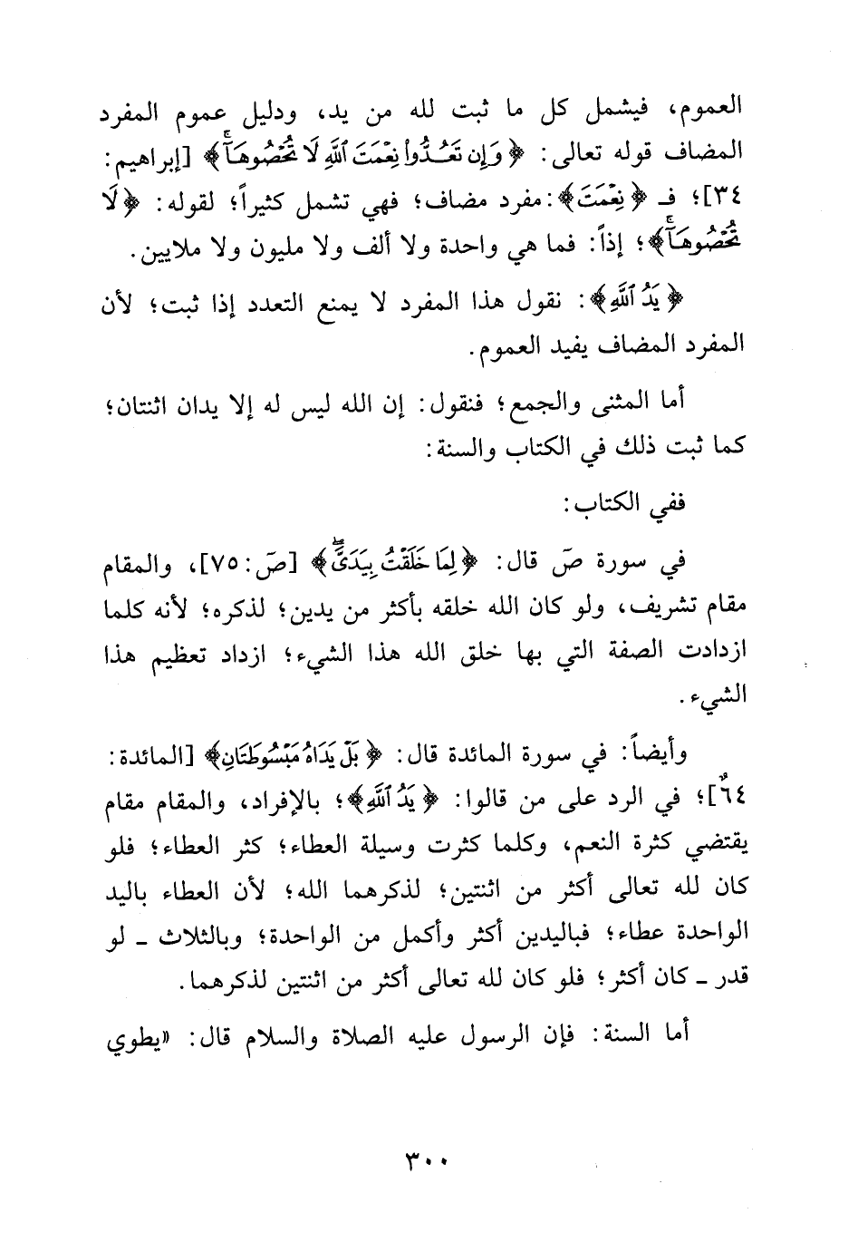 العموم، فيشمل كل ما ثبت لله من يد، ودليل عموم المفرد المضاف قوله تعالى: {وَإِنْ تَعُدُّوا نِعْمَتَ اللَّهِ لا تُحْصُوهَا} [إبراهيم: 34]، فـ {نِعْمَتَ}: مفرد مضاف، فهي تشمل كثيراً، لقوله: {لا تُحْصُوهَا}، إذاً: فما هي واحدة ولا ألف ولا مليون ولا ملايين.