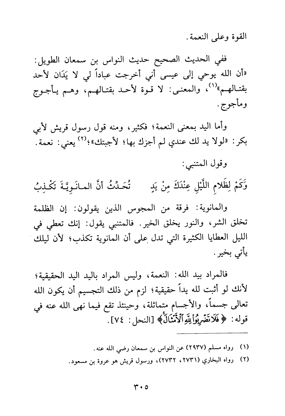 وأما اليد بمعنى النعمة، كثير، ومنه قول رسول قريش لأبي بكر: "لولا يد لك عندي لم أجزك بها، لأجبتك" (¬2)، يعني: نعمة.