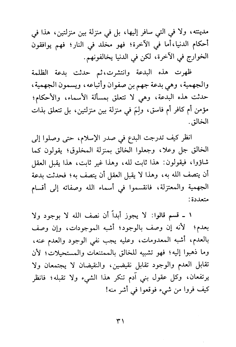 1 - قسم قالوا: لا يجوز أبداً أن نصف الله لا بوجود ولا بعدم، لأنه إن وصف بالوجود، أشبه الموجودات، وإن وصف بالعدم، أشبه المعدومات، وعليه يجب نفي الوجود والعدم عنه، وما ذهبوا إليه، فهو تشبيه للخالق بالممتنعات والمستحيلات، لأن تقابل العدم والوجود تقابل نقيضين، والنقيضان لا يجتمعان ولا يرتفعان، وكل عقول بني آدم تنكر هذا الشيء ولا تقبله، فانظر كيف فروا من شيء فوقعوا في أشر منه!