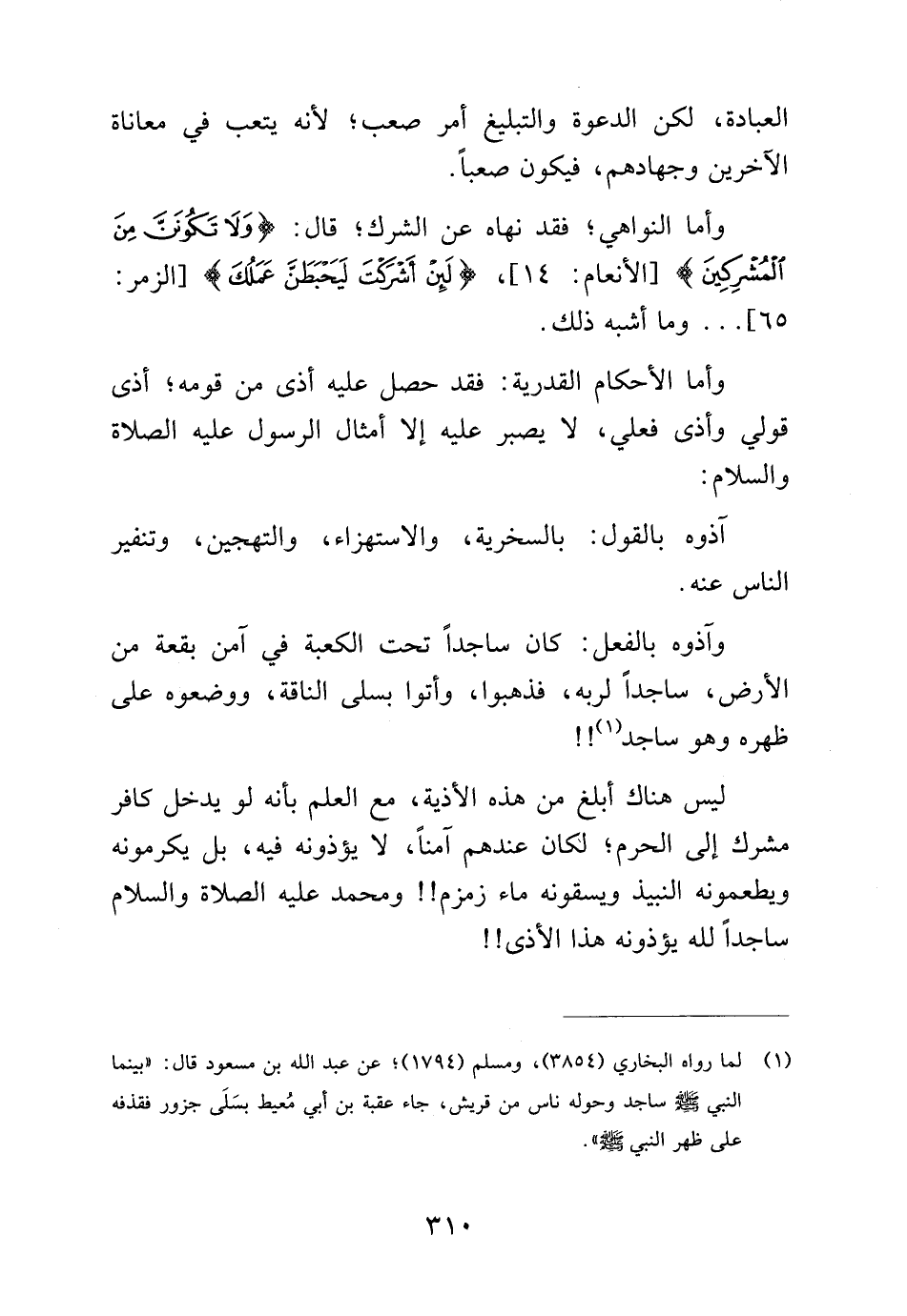 ليس هناك أبلغ من هذه الأذية مع العلم بأنه لو يدخل كافر مشرك إلى الحرم، لكان عندهم آمناً، لا يؤذونه فيه، بل يكرمونه ويطعمونه النبيذ ويسقونه ماء زمزم!! ومحمد عليه الصلاة والسلام ساجداً لله يؤذونه هذا الأذى!!