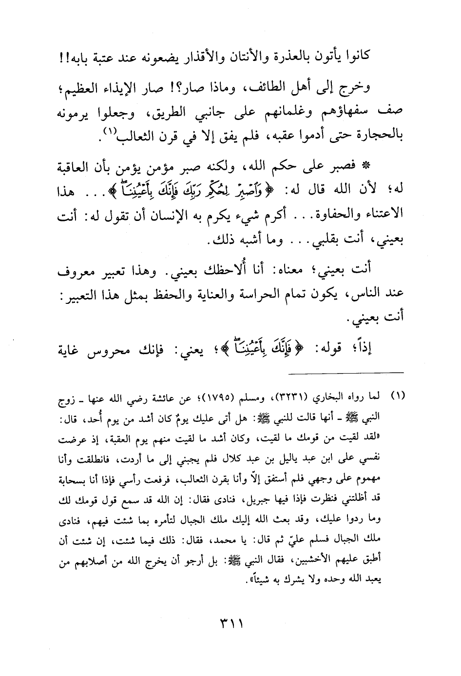 (¬1) رواه البخاري (3231) كتاب بدء الخلق/ باب إذا قال أحدكم "أمين"، ومسلم (1795) عن عائشة رضي الله عنها- زوج النبي صلى الله عليه وسلم – أنها قالت للنبي صلى الله عليه وسلم: هل أتى عليك يوم كان أشد من يوم أحد, قال: "لقد لقيت من قومك ما لقيت, وكان أشد مالقيت منهم يوم العقبة, إذ عرضت نفسي على ابن عبد ياليل بن عبد كلال فلم يجبني إلى ما أردت, فانطلقت وأنا مهموم على وجهي فلم أستفق إلا وأنا بقرن الثعاليب, فرفعت رأسي فإذا أنا بسحابة قد أظلتني فنظرت فإذا فيها جبريل, فنادى فقال: إن الله قد سمع قول قومك لك وما ردوا عليك, وقد بعث الله إليك ملك الجبال لتأمره بما شئت فيهم, إن شئت أن أطبق عليهم الأخشبين, فقال النبي صلى الله عليه وسلم: بل أرجوا أن يخرج الله من أصلابه من يعبد الله وحده ولايشرك به شيئاً". كتاب الجهاد/ باب ما لقي النبي صلى الله عليه وسلم في أذى المشركين.