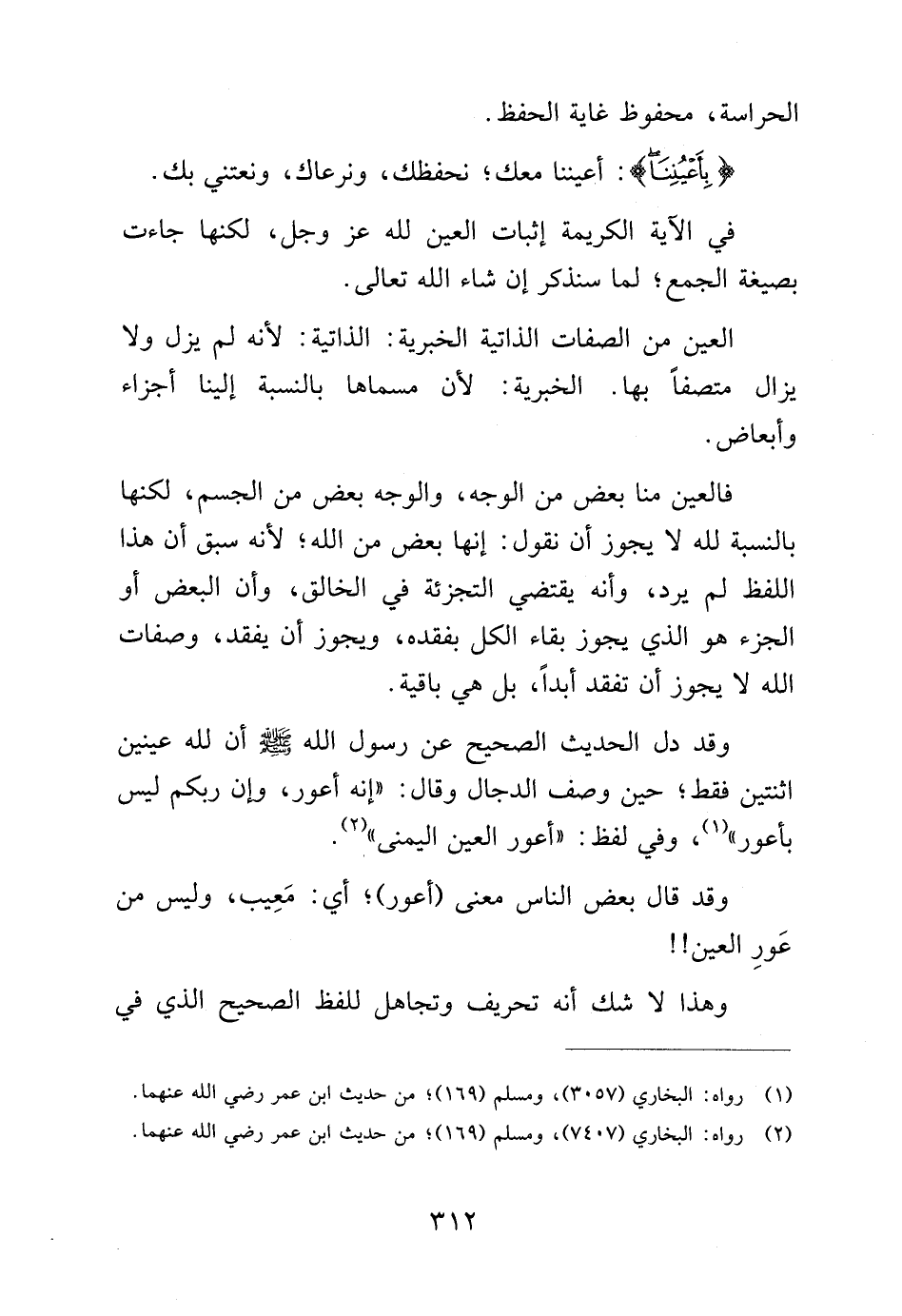 وقد دل الحديث الصحيح عن رسول الله صلى الله عليه وسلم أن لله عينين اثنتين فقط، حين وصف الدجال وقال: "إنه أعور، وإن ربكم ليس بأعور" (¬1)، وفي لفظ: "أعور العين اليمنى" (¬2).