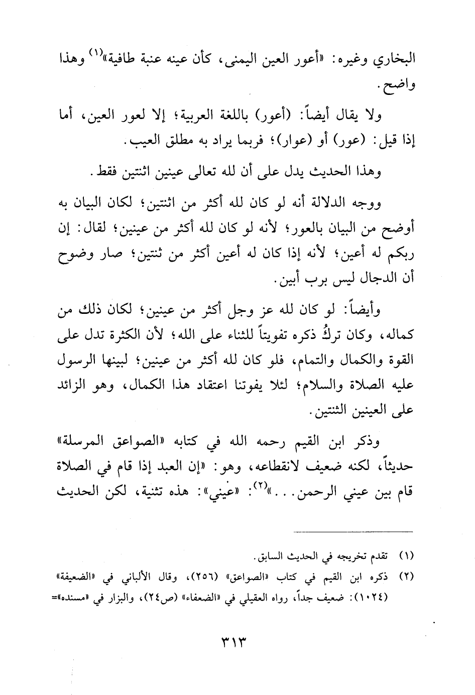 وذكر ابن القيم رحمه الله في كتابه "الصواعق المرسلة" حديثاً، لكنه ضعيف لانقطاعه، وهو: "إن العبد إذا قام في الصلاة قام بين عيني الرحمن ... " (¬2): "عيني": هذه تثنية، لكن الحديث