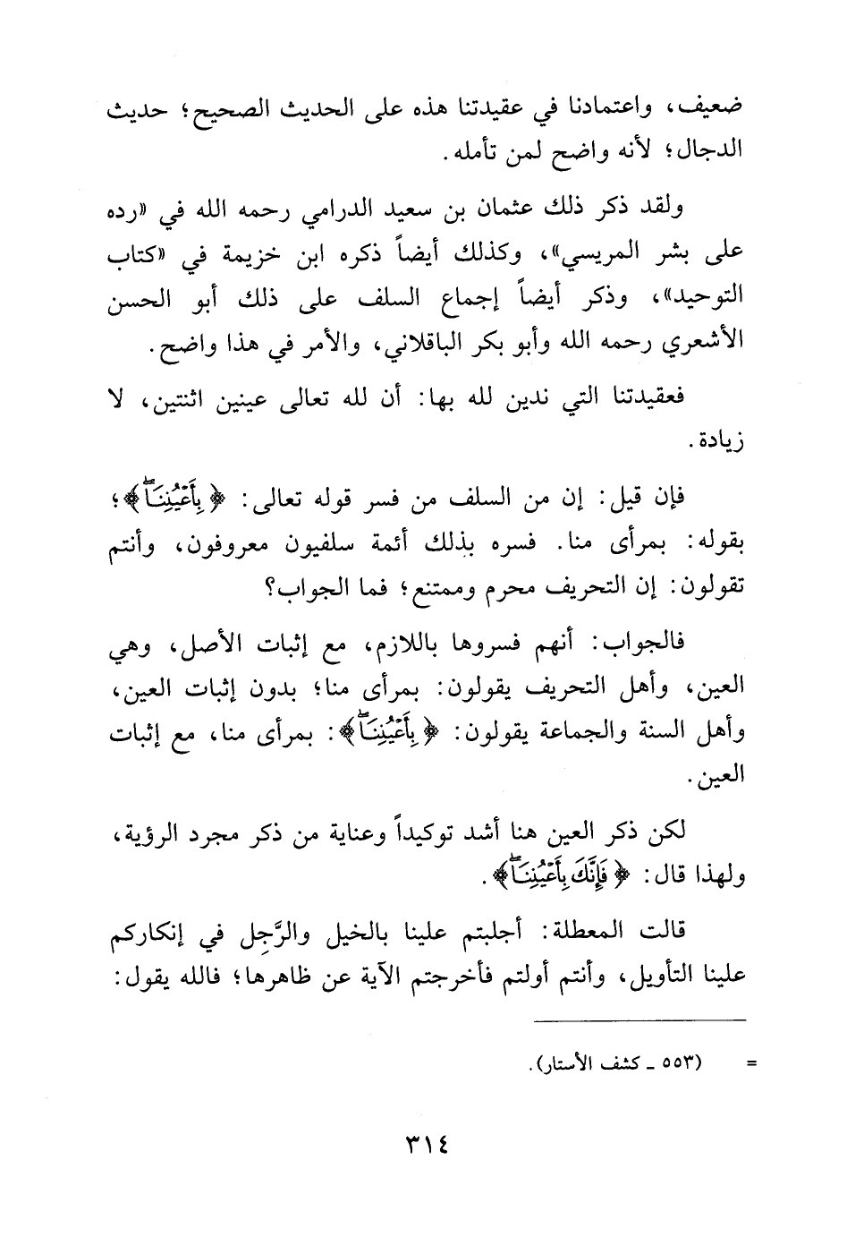 فإن قيل: إن من السلف من فسر قوله تعالى: {بِأَعْيُنِنَا}، بقوله: بمرأى منا. فسره بذلك أئمة سلفيون معروفون، وأنتم تقولون: إن التحريف محرم وممتنع، فما الجواب؟