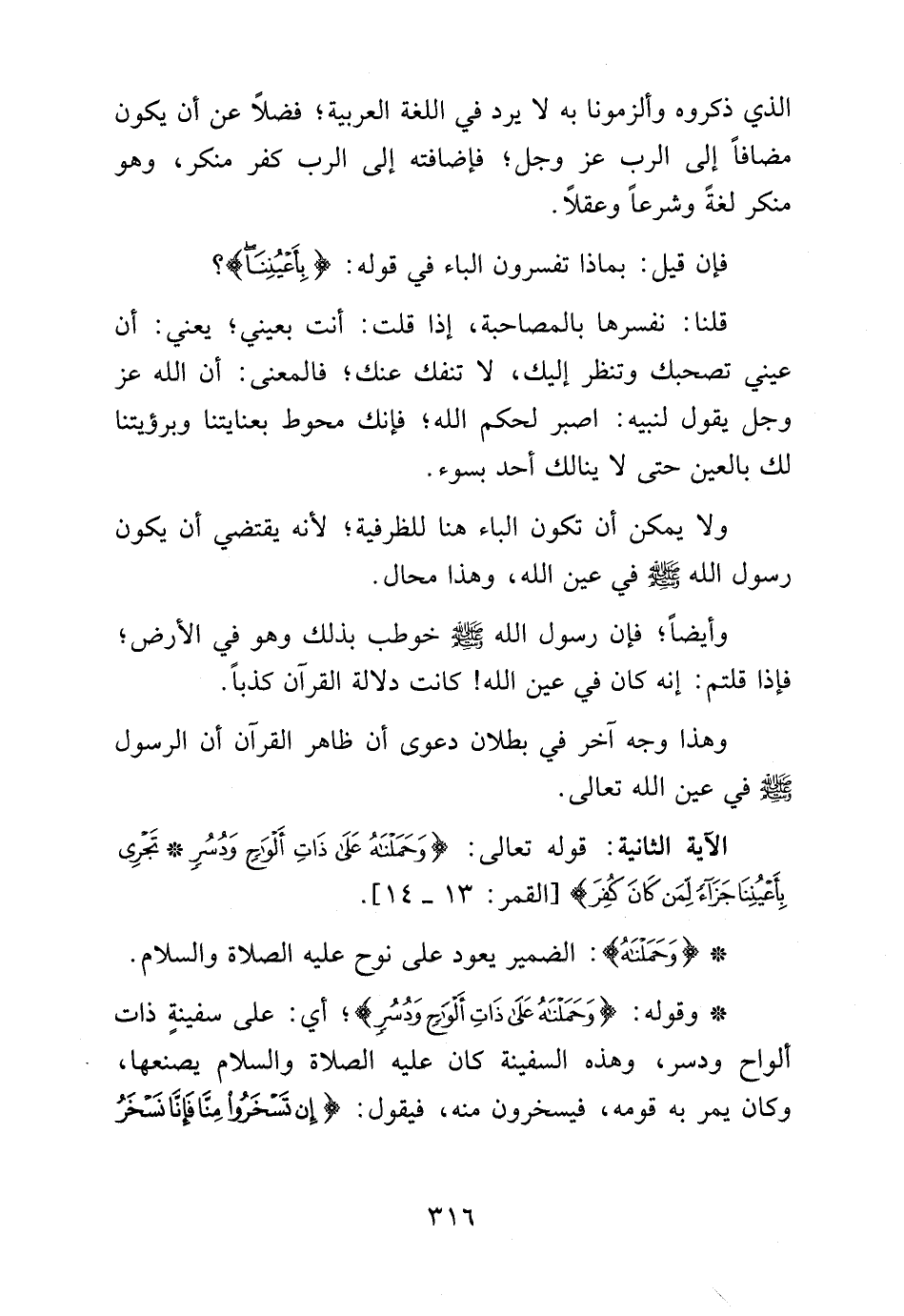 الآية الثانية: قوله تعالى: {وَحَمَلْنَاهُ عَلَى ذَاتِ أَلْوَاحٍ وَدُسُرٍ تَجْرِي بِأَعْيُنِنَا جَزَاءً لِمَنْ كَانَ كُفِرَ} [القمر: 13 - 14].