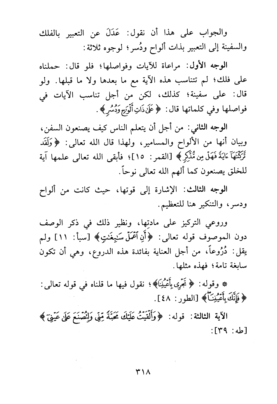 الوجه الأول: مرعاة للآيات وفواصلها، فلو قال: حملنا على فلك، لم تتناسب هذه الآية مع ما بعدها ولا ما قبلها. ولو قال: على سفينة، كذلك، لكن من أجل تناسب الآيات في فواصلها وفي كلماتها قال: {عَلَى ذَاتِ أَلْوَاحٍ وَدُسُرٍ}.