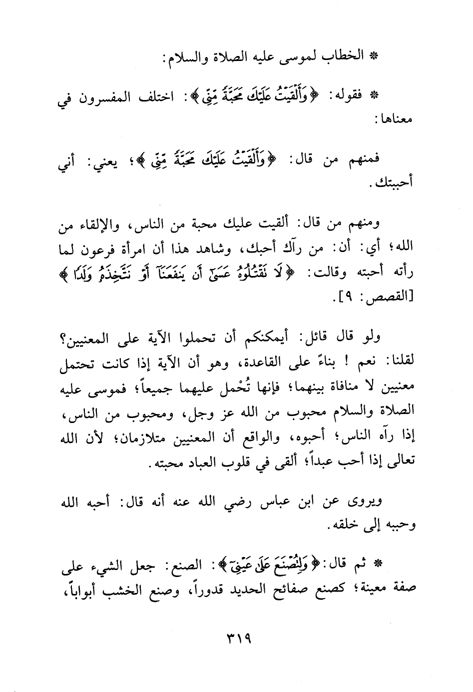 ومنهم من قال: ألقيت عليك محبة من الناس، والإلقاء من الله، أي أن: من رآك أحبك، وشاهد هذا أن امرأة فرعون لما رأته أحبته وقالت: {لا تَقْتُلُوهُ عَسَى أَنْ يَنْفَعَنَا أَوْ نَتَّخِذَهُ وَلَداً} [القصص: 9].