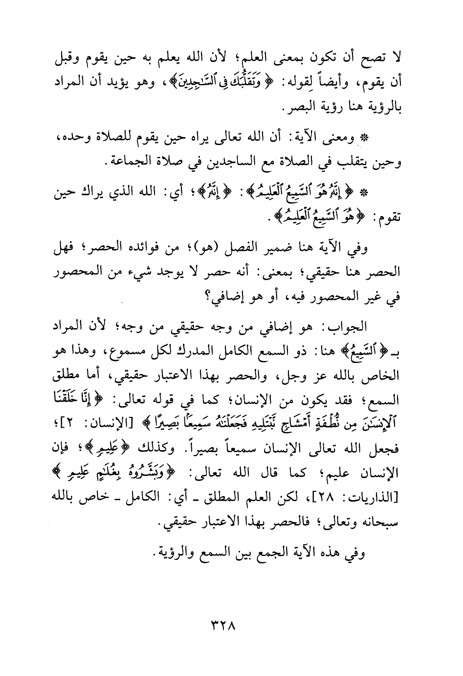 لا تصح أن تكون بمعنى العلم، لأن الله يعلم به حين يقوم وقبل أن يقوم، وأيضاً لقوله: {وَتَقَلُّبَكَ فِي السَّاجِدِينَ} وهو يؤيد أن المراد بالرؤية هنا رؤية البصر.