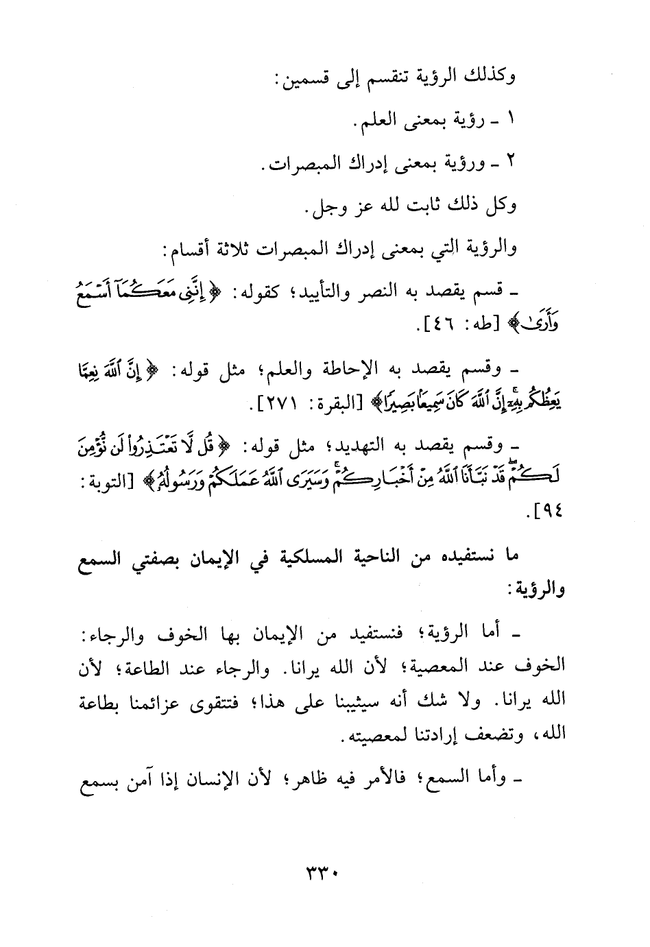 - أما الرؤية، فنستفيد من الإيمان بها الخوف والرجاء: الخوف عند المعصية، لأن الله يرانا. والرجاء عند الطاعة، لأن الله يرانا. ولا شك أنه سيثيبنا على هذا، فتتقوى عزائمنا بطاعة الله، وتضعف إرادتنا لمعصيته.