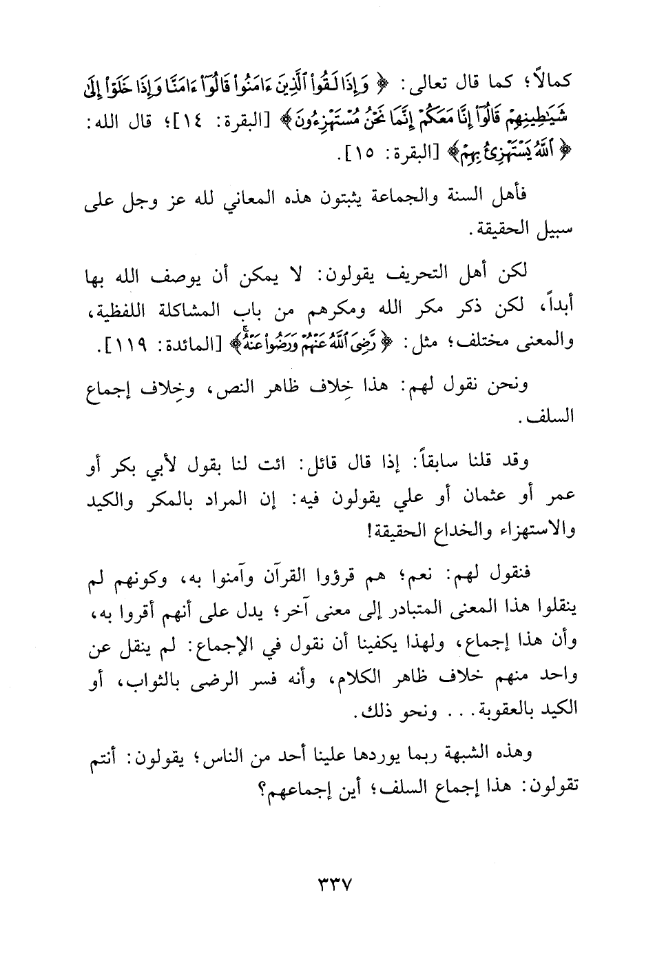 ونحن نقول لهم: هذا خلاف ظاهر النص, وخلاف إجماع السلف. وقد قلنا سابقاً: إذا قال قائل: أئت لنا بقول لأبي بكر أو عمر أو عثمان أو علي يقولون فيه: إن المراد بالمكر والاستهزاء والخداع الحقيقة!