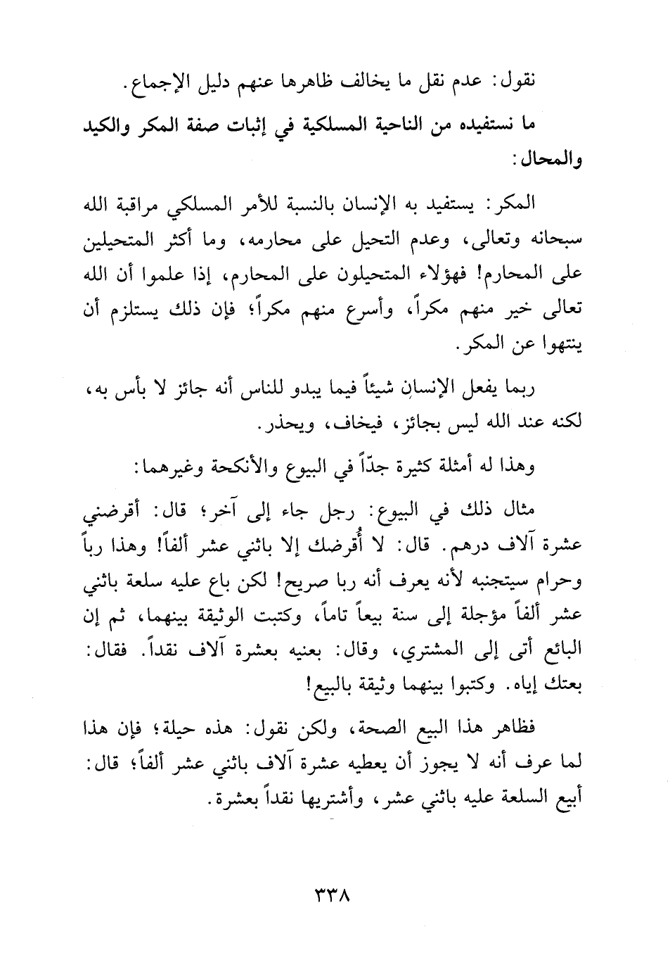 مثال ذلك في البيوع: رجل جاء إلى آخر؛ قال: أقرضني عشرة آلاف درهم. قال: لا أقرضك إلا بأثني عشر ألف وهذا رباً وحرام سيتجنبه لأنه يعرف أنه رباً صريح لكن باع عليه سلعة بأثنى عشر ألفاً مؤجلة إلى سنة بيعاً تاماً وكتبت الوثيقة بينهما، ثم إن البائع أتى إلى المشترى, وقال: بعنية بعشرة ألاف نقداً. فقال: بعتك إياه. وكتبوا بينهما وثيقة بالبيع!