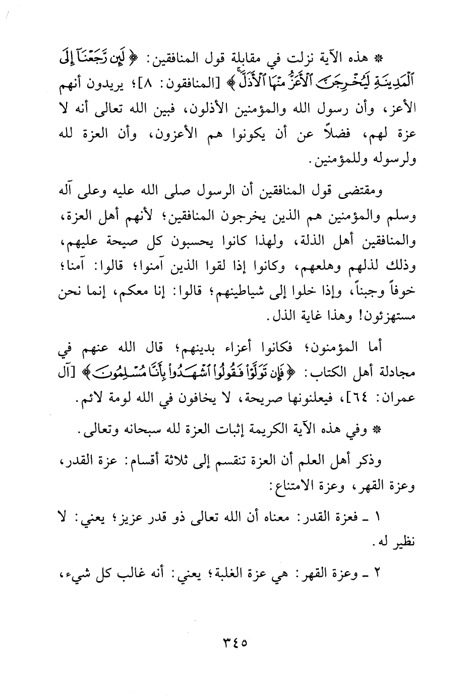ومقتضى قول المنافقين أن الرسول صلى الله عليه وسلم، وعلي آله وسلم والمؤمنين هم الذين يخرجون المنافقين، لأنهم أهل العزة، والمنافقين أهل الذلة، ولهذا كانوا يحسبون كل صيحة عليهم، وذلك لذلهم وهلعهم، وكانوا إذا لقوا الذين آمنوا، قالوا: آمنا، خوفاً وجبناً، وإذا خلوا إلي شياطينهم, قالوا: إنا معكم، إنما نحن مستهزءون! وهذا غاية الذل.
