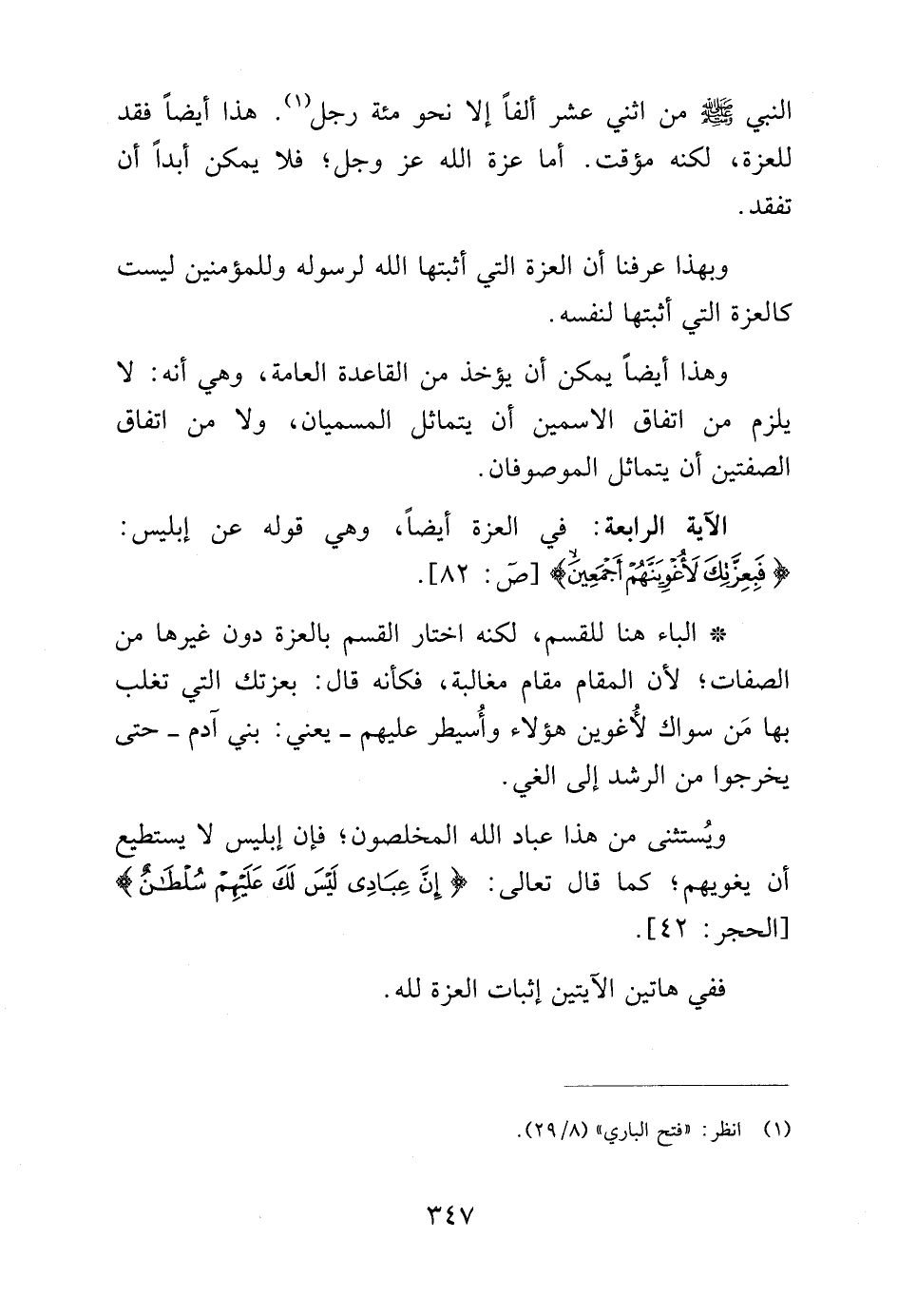 الآية الرابعة: في العزة أيضاً، وهي قوله عن إبليس: {قَالَ فَبِعِزَّتِكَ لأُغْوِيَنَّهُمْ أَجْمَعِينَ} [ص: 82].