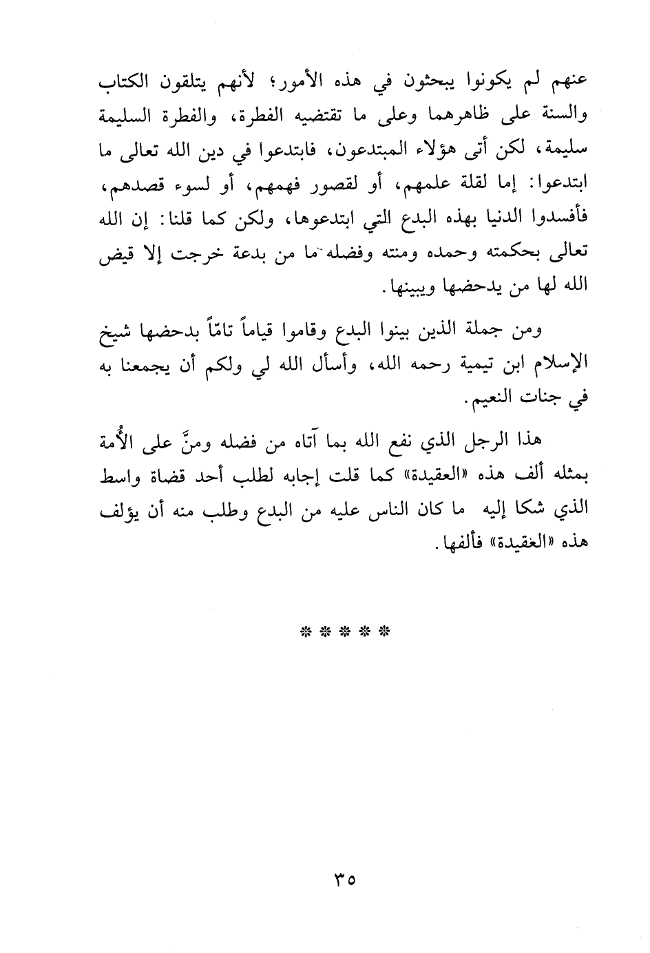 هذا الرجل الذي نفع الله بما آتاه من فضله ومن على الأمة بمثله ألف هذه "العقيدة" كما قلت إجابة لطلب أحد قضاة واسط الذي شكا إليه ما كان الناس عليه من البدع وطلب منه أن يؤلف هذه "العقيدة" فألفها.