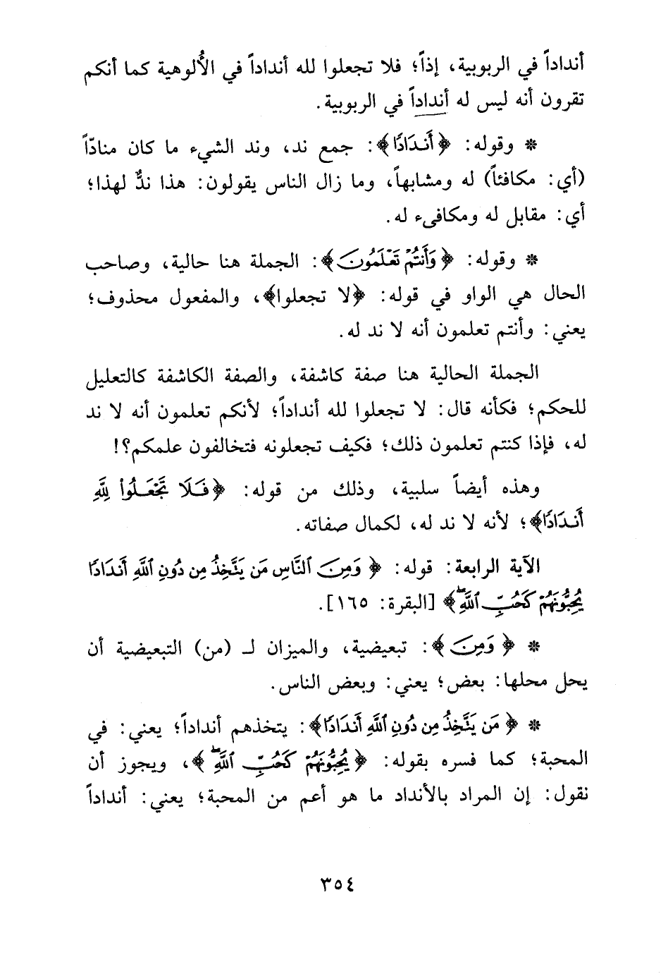 وقوله: {أَنْدَاداً}: جمع ند، وند الشيء ما كان مناداً (أي مكافئاً) له ومتشابهاً، وما زال الناس يقولون: هذا ند لهذا، أي: مقابل له ومكافئله.