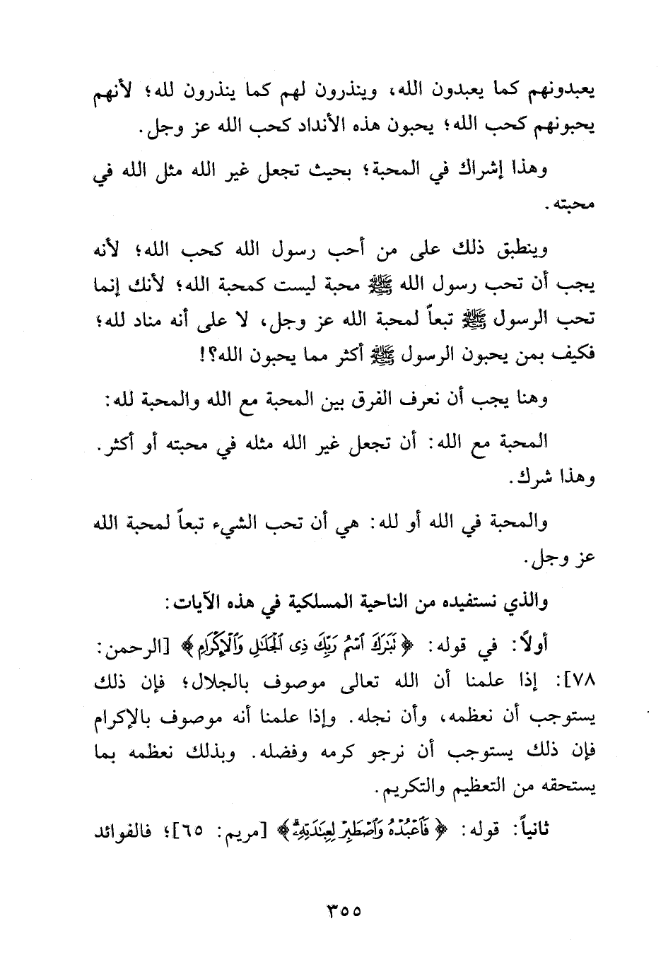 أولا: في قوله: {تَبَارَكَ اسْمُ رَبِّكَ ذِي الْجَلالِ وَالأِكْرَامِ} [الرحمن: 78]: إذا علمنا أن الله تعالي موصوف بالجلال، فإن ذلك يستوجب أن نعظمه، وأن نجله. وإذا علمنا أنه موصوف بالإكرام فإن ذلك يستوجب أن نرجو كرمه وفضله. وبذلك نعظمه بما يستحقه من التعظيم والتكريم.