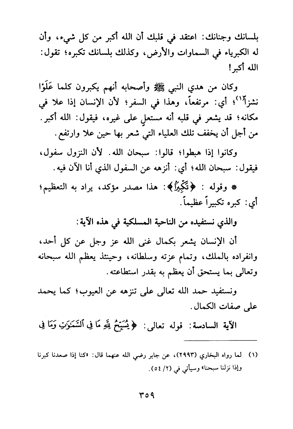 (¬1) رواه البخاري (2993) كتاب الجهاد/ باب التسبيح إذا هبط وادياً عن جابر رضي الله عنهما قال: "كنا إذا صعدنا كبرنا وإذا نزلنا سبحنا" وسيأتي في (2/ 54).