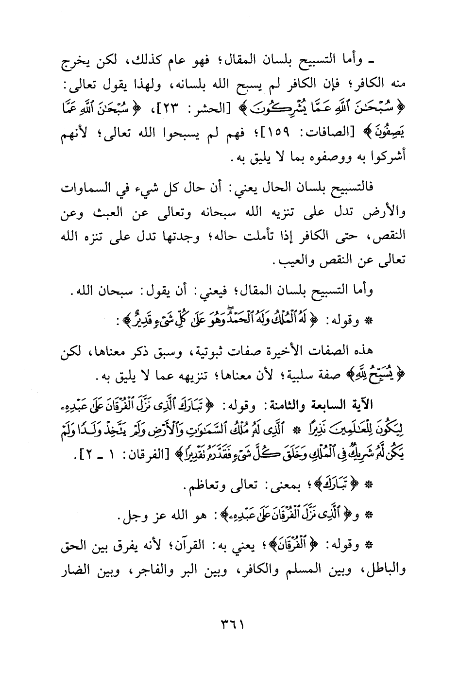 - وأما التسبيح بلسان المقال، فهو عام كذلك، لكن يخرج منه الكافر، فإن الكافر لم يسبح الله بلسانه، ولهذا يقول تعالى: {سُبْحَانَ اللَّهِ عَمَّا يُشْرِكُونَ} [الحشر: 23]، {سُبْحَانَ اللَّهِ عَمَّا يَصِفُونَ} [الصافات: 159] فهم لم يسبحوا الله تعالى، لأنهم أشركوا به ووصفوه بما لا يليق به.
