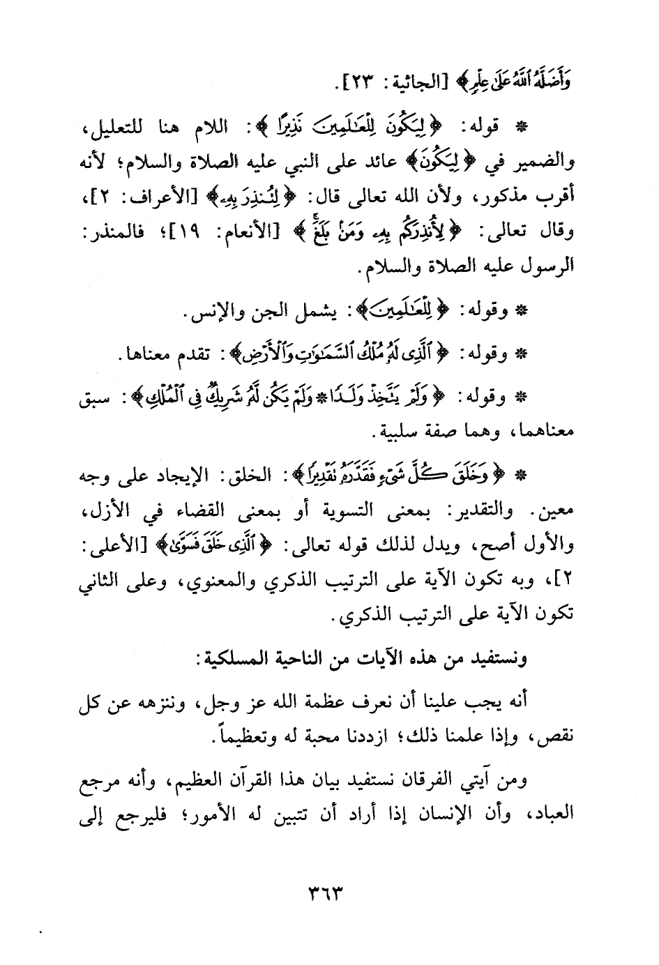 قوله: {لِيَكُونَ لِلْعَالَمِينَ نَذِيراً}: اللام هنا للتعليل، والضمير في {لِيَكُونَ} عائد على النبي عليه الصلاة والسلام، لأنه أقرب مذكور، ولأن الله تعالي قال: {لِتُنْذِرَ بِهِ} [الأعراف: 2]، وقال تعالي: {لأُنْذِرَكُمْ بِهِ وَمَنْ بَلَغَ} [الأنعام: 19] , فالمنذر: الرسول عليه الصلاة والسلام.