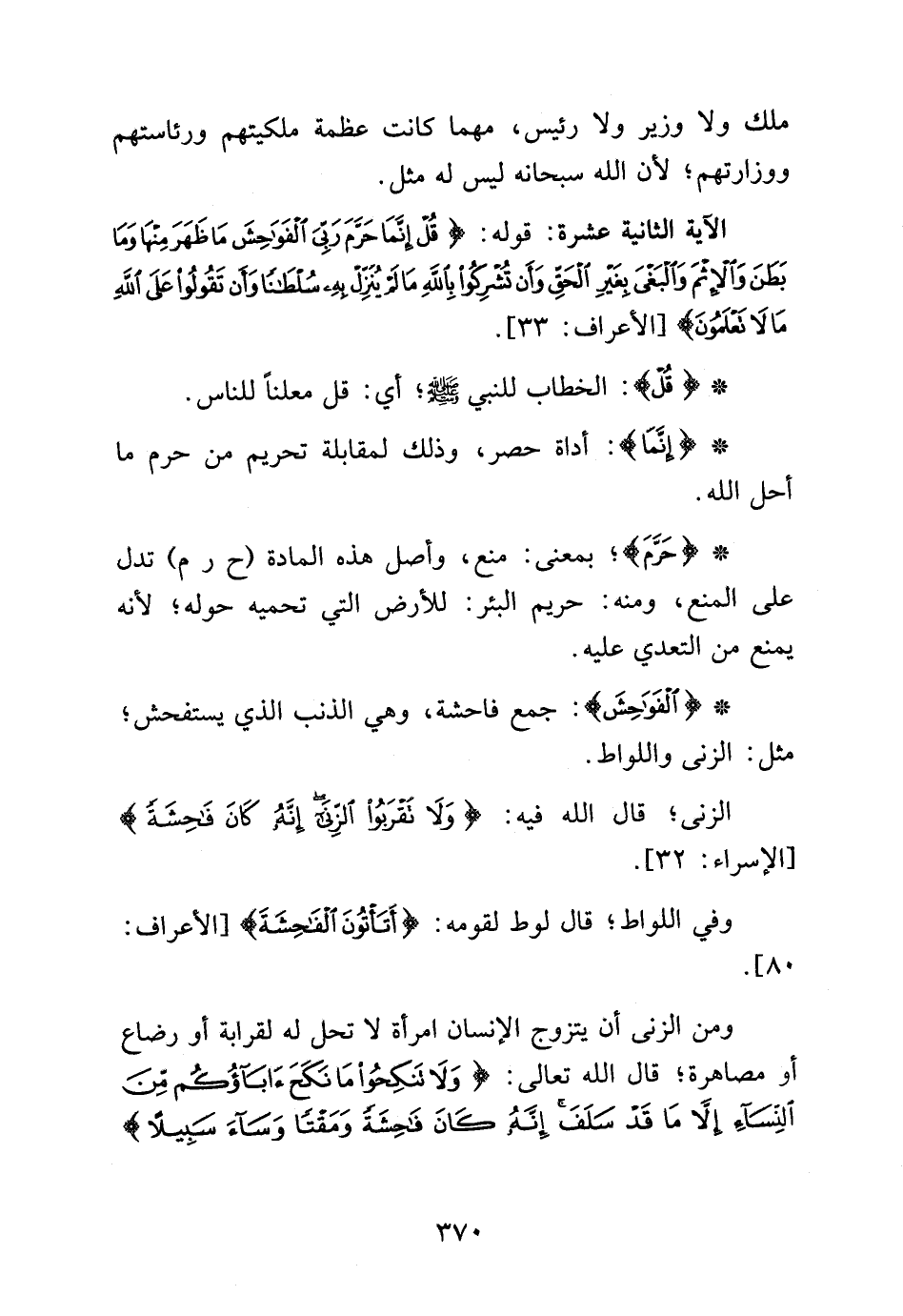 الآية الثانية عشرة: قوله: {قُلْ إِنَّمَا حَرَّمَ رَبِّيَ الْفَوَاحِشَ مَا ظَهَرَ مِنْهَا وَمَا بَطَنَ وَالأِثْمَ وَالْبَغْيَ بِغَيْرِ الْحَقِّ وَأَنْ تُشْرِكُوا بِاللَّهِ مَا لَمْ يُنَزِّلْ بِهِ سُلْطَاناً وَأَنْ تَقُولُوا عَلَى اللَّهِ مَا لا تَعْلَمُونَ} [الأعراف: 33].