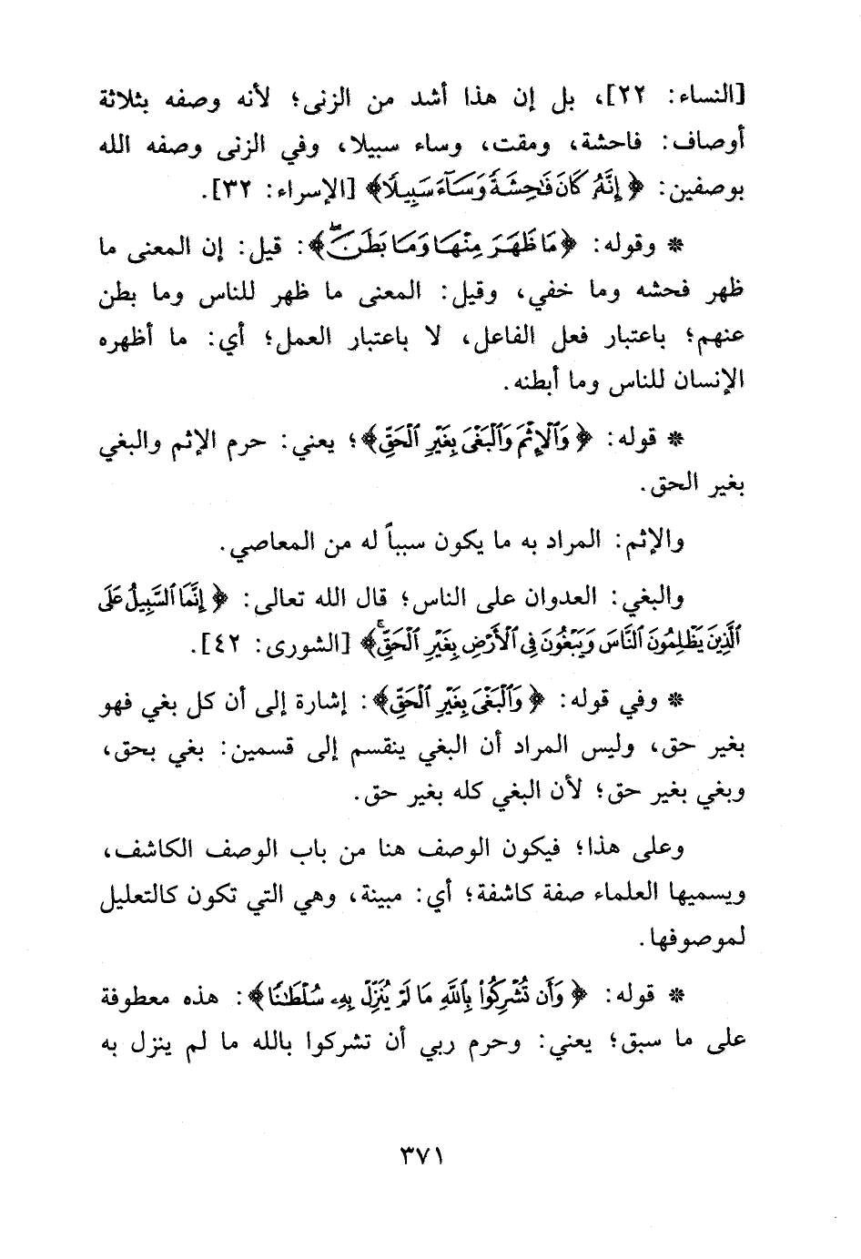 وفي قوله: {وَالْبَغْيَ بِغَيْرِ الْحَقِّ}: إشارة إلى أن كل بغي فهو بغير حق، وليس المراد أن البغي ينقسم إلى قسمين: بغي بحق، وبغي بغير حق، لأن البغي كله بغير حق.