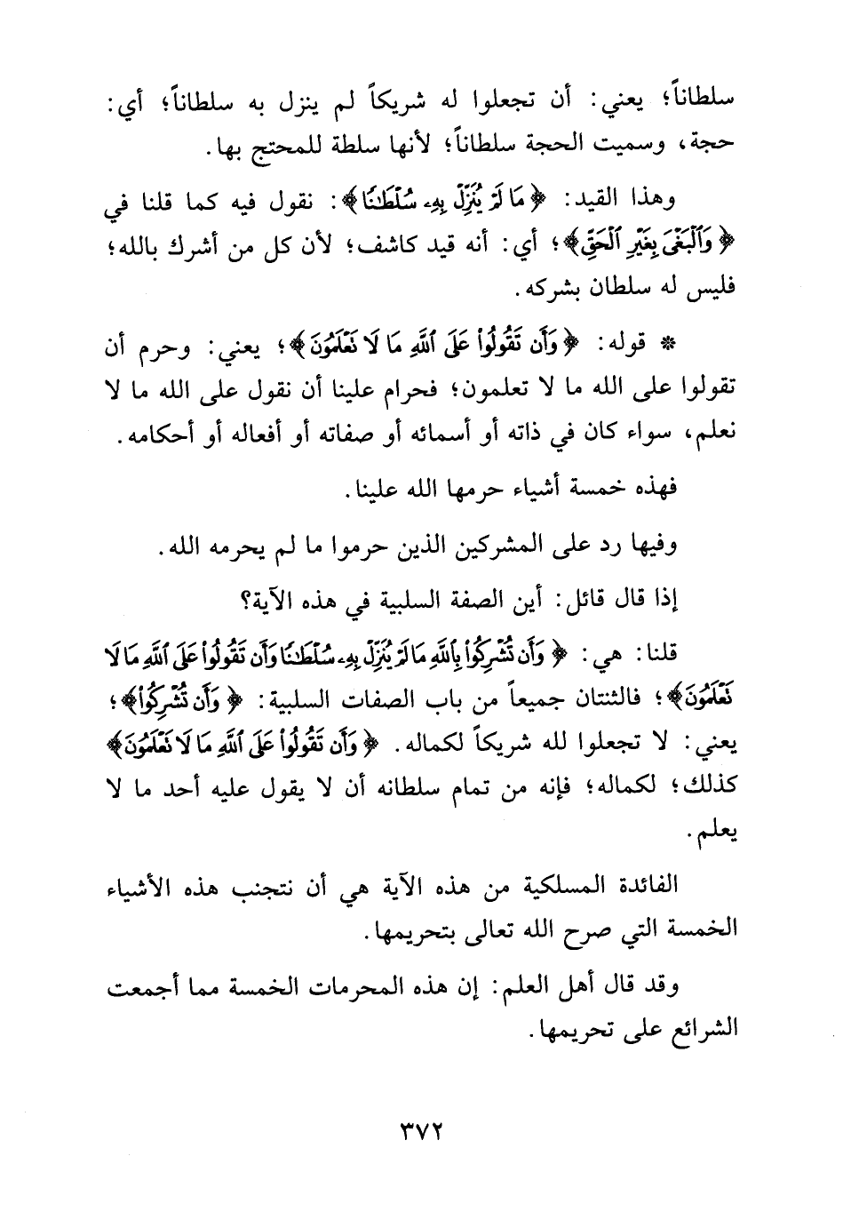 قلنا: هي {وَأَنْ تُشْرِكُوا بِاللَّهِ مَا لَمْ يُنَزِّلْ بِهِ سُلْطَاناً وَأَنْ تَقُولُوا عَلَى اللَّهِ مَا لا تَعْلَمُونَ}، فالاثنتان جميعاً من باب الصفات السلبية: {وَأَنْ تُشْرِكُوا}، يعني: لا تجعلوا لله شريكاً لكماله. {وَأَنْ تَقُولُوا عَلَى اللَّهِ مَا لا تَعْلَمُونَ} كذلك، لكماله، فإنه من تمام سلطانه أن لا يقول عليه أحد ما لا يعلم.