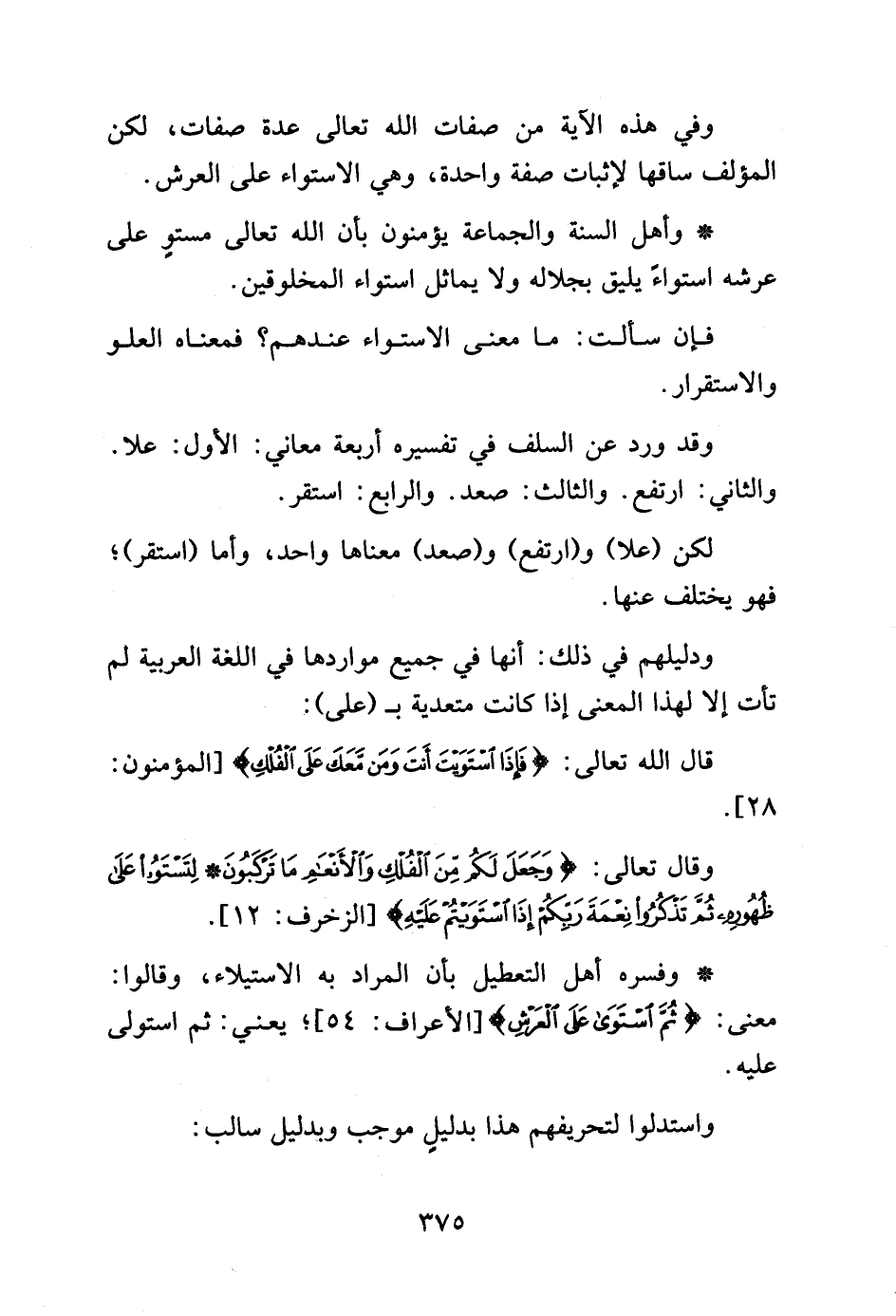 فإن سألت: ما معنى الاستواء عندهم؟ فمعناه العلو والاستقرار.