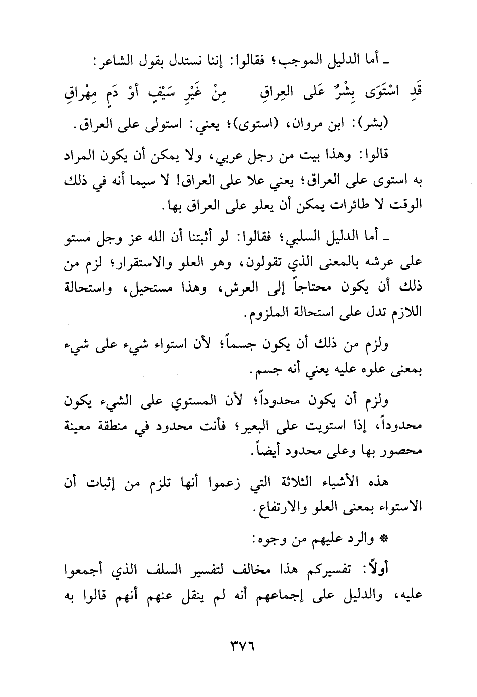 قالوا: وهذا بيت بن رجل عربي، ولا يمكن أن يكون المراد به استوى على العراق، يعني علا على العراق! لا سيما أنه في ذلك الوقت لا طائرات يمكن أن يعلو على العراق بها.