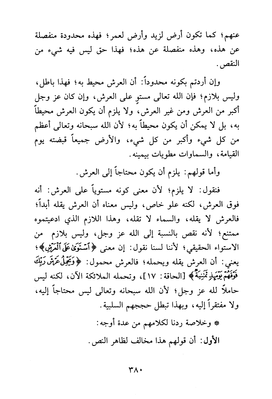 فنقول: لا يلزم، لأن معنى كونه مستوياً على العرش: أنه فوق العرش، لكنه علو خالص، وليس معناه أن العرش يقله أبداً، فالعرش لا يقله، والسماء لا تقله، وهذا اللازم الذي ادعيتموه ممتنع، لأنه نقص بالنسبة إلى الله عز وجل، وليس بلازم من الاستواء الحقيقي، لأننا لسنا نقول: إن معنى {اسْتَوَى عَلَى الْعَرْشِ}، يعني: أن العرش يقله ويحمله، فالعرش محمول: {وَيَحْمِلُ عَرْشَ رَبِّكَ فَوْقَهُمْ يَوْمَئِذٍ ثَمَانِيَةٌ} [الحاقة: 17]، وتحمله الملائكة الآن، لكنه ليس حاملاً لله عز وجل، لأن الله سبحانه وتعالى ليس محتاجاً إليه، ولا مفتقراً إليه، وبهذا تبطل حججهم السلبية.