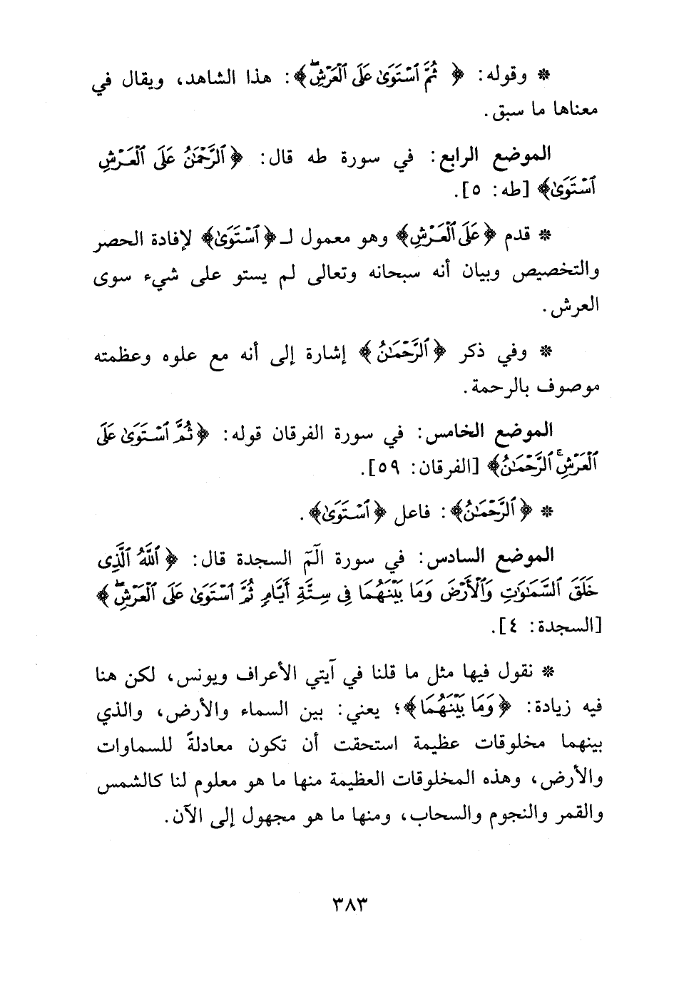 وقال في سورة آلم السجدة: {اللَّهُ الَّذِي خَلَقَ السَّمَاوَاتِ وَالأَرْضَ وَمَا بَيْنَهُمَا فِي سِتَّةِ أَيَّامٍ ثُمَّ اسْتَوَى عَلَى الْعَرْشِ} , وقال في سورة الحديد: {هُوَ الَّذِي خَلَقَ السَّمَاوَاتِ وَالأَرْضَ فِي سِتَّةِ أَيَّامٍ ثُمَّ اسْتَوَى عَلَى الْعَرْشِ}.