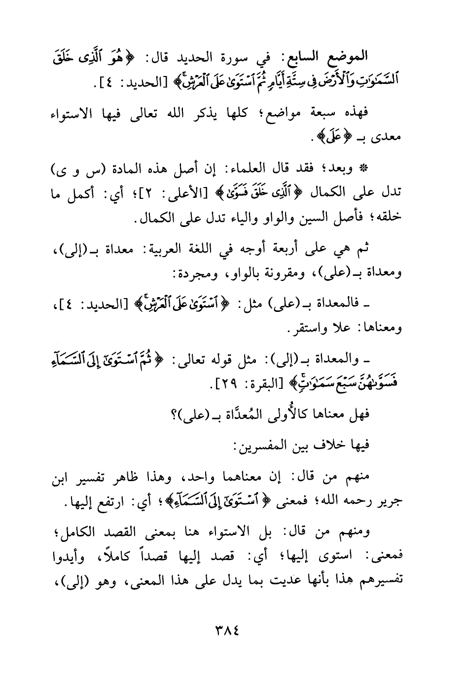 ومنهم من قال: بل الاستواء هنا بمعنى القصد الكامل؛ فمعنى: استوى إليها؛ أي: قصد إليها قصداً كاملاً, وأيدوا تفسيرهم هذا بأنها عديت بما يدل على هذا المعنى, وهو (إلى) ,