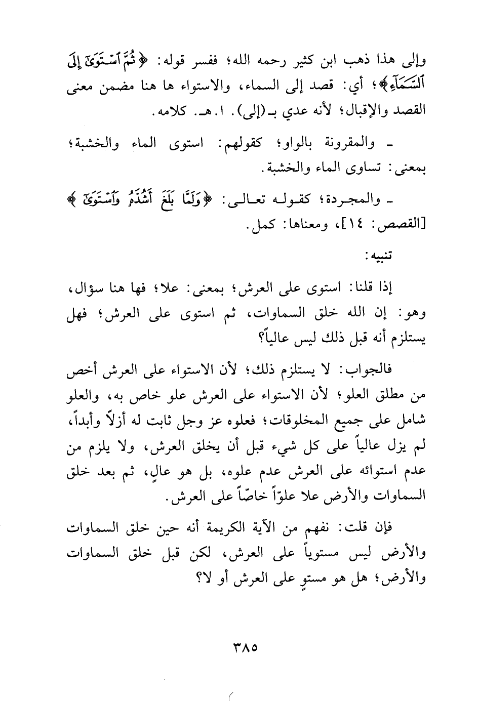 وإلى هذا ذهب ابن كثير رحمه الله؛ ففسر قوله: {ثُمَّ اسْتَوَى إِلَى السَّمَاءِ}؛ أي: قصد إلى السماء، وإلا ستواء ها هنا مضمن معنى القصد والإقبال؛ لأنه عدي بـ (إلى).أ. هـ كلامه.
