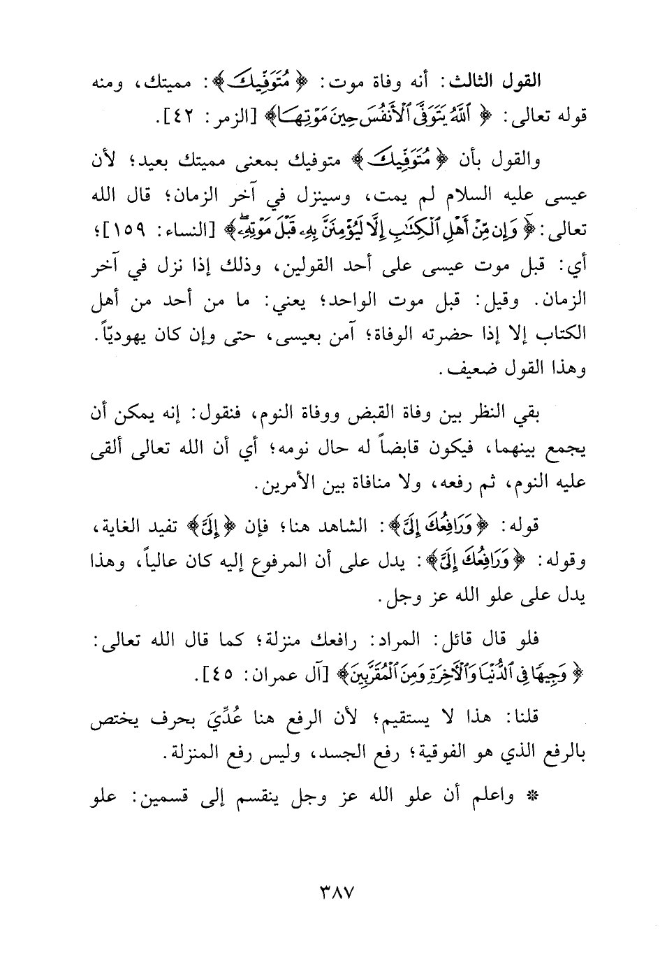 والقول بأن {مُتَوَفِّيكَ} متوفيك بمعنى مميتك بعيد؛ لأن عيسى عليه السلام لم يمت، وسينزل في آخر الزمان؛ قال الله تعالى: {وَإِنْ مِنْ أَهْلِ الْكِتَابِ إِلاَّ لَيُؤْمِنَنَّ بِهِ قَبْلَ مَوْتِهِ} [النساء: 159]؛ أي: قبل موت عيسى على أحد القولين، وذلك إذا نزل في آخر الزمان. وقيل: قبل موت الواحد؛ يعني: ما من أحد من أهل الكتاب إلا إذا حضرته الوفاة؛ أمن بعيسى, حتى وإن كان يهودياً. وهذا القول ضعيف.