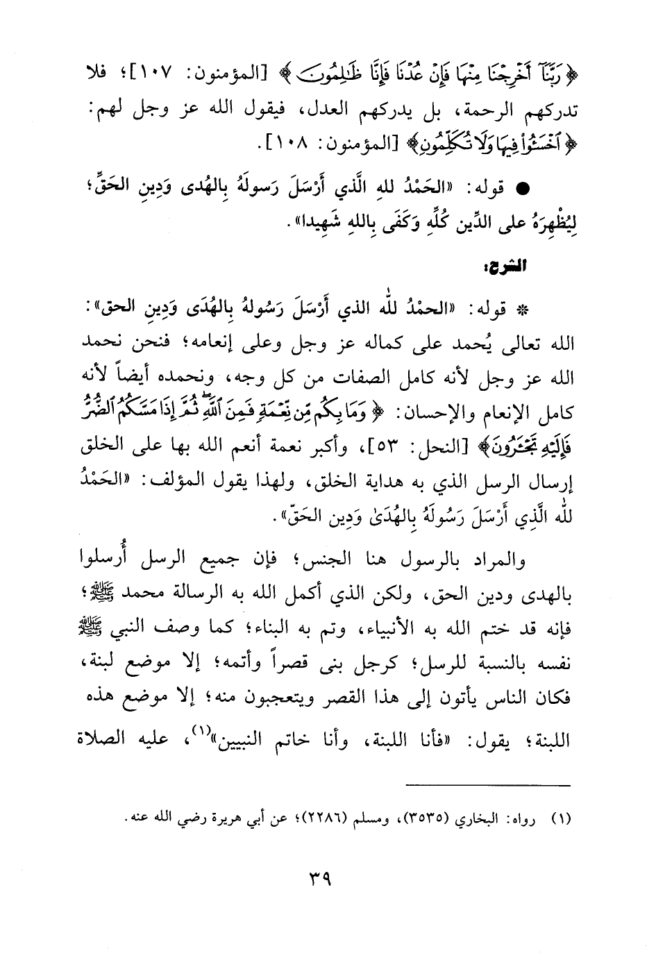 قوله: "الحمد لله الذي أرسل رسوله بالهدى ودين الحق": الله تعالى يحمد على كماله عز وجل وعلى إنعامه، فنحن نحمد الله عز وجل لأنه كامل الصفات من كل وجه، ونحمده أيضاً لأنه كامل الأنعام والإحسان: {وَمَا بِكُمْ مِنْ نِعْمَةٍ فَمِنَ اللَّهِ ثُمَّ إِذَا مَسَّكُمُ الضُّرُّ فَإِلَيْهِ تَجْأَرُونَ} [النحل: 53]، وأكبر نعمة أنعم الله بها على الخلق إرسال الرسل الذي به هداية الخلق، ولهذا يقول المؤلف: "الحمد لله الذي أرسل رسول رسوله بالهدى ودين الحق".