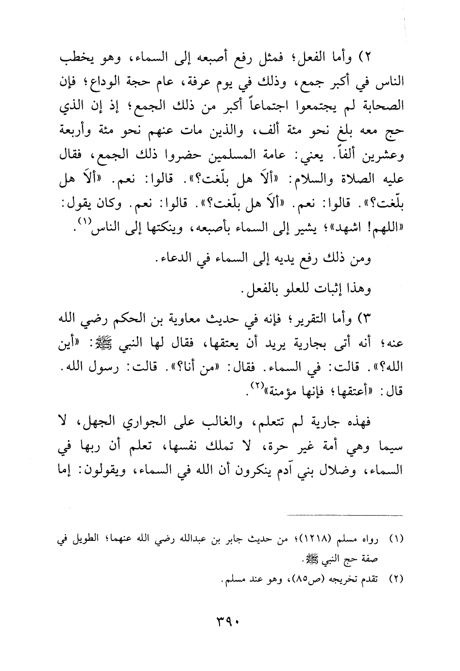 3) وأما التقرير؛ فإنه في حديث معاوية بن الحكم رضي الله عنه؛ أنه أتى بجارية يريد أن يعتقها, فقال لها النبي صلى الله عليه وسلم: "أين الله؟ ". قالت: في السماء. فقال: "من أنا؟ ". قالت: رسول الله. قال: "أعتقها؛ فإنها مؤمنة" (¬2).