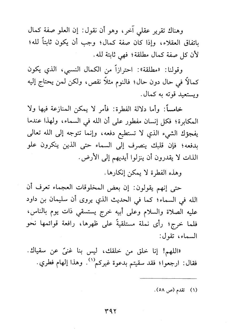 خامساً: وأما دلالة الفطرة: فأمر لا يمكن المنازعة فيها ولا المكابرة؛ فكل إنسان مفطور على أن الله في السماء, ولهذا عندما يفجؤك الشيء الذي لا تستطيع دفعه، وإنما تتوجه إلى الله تعالى بدفعه؛ فإن قلبك ينصرف إلى السماء حتى الذين ينكرون علو الذات لا يقدرون أن ينزلوا أيديهم إلى الأرض.