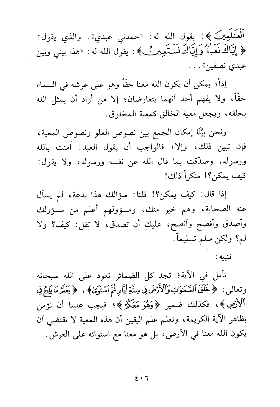 إذاً، يمكن أن يكون الله معنا حقاً وهو على عرشه في السماء حقاً، ولا يفهم أحداً أنهما يتعارضان، إلا من أراد أن يمثل الله بخلقه، ويجعل معية الخالق كمعية المخلوق.