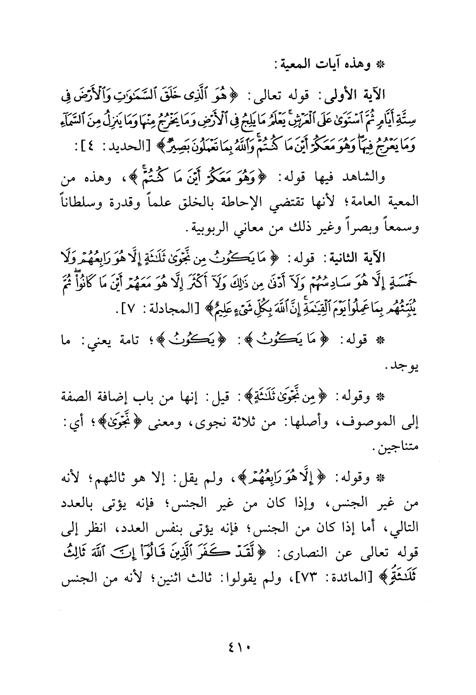 وقوله: {إِلاّ هُوَ رَابِعُهُمْ} ولم يقل: إلا هو ثالثهم؛ لأنه من غير الجنس, وإذا كان من غير الجنس, فإنه يؤتى بالعدد التالي، أما إذا كان من الجنس؛ فإنه يؤتى بنفس العدد، أنظر قوله تعالى عن النصارى: {لَقَدْ كَفَرَ الَّذِينَ قَالُوا إِنَّ اللَّهَ ثَالِثُ ثَلاثَةٍ} [المائدة: 73] , ولم يقولوا: ثالث أثنين؛ لأنه من الجنس على زعمهم فعندهم كل الثلاثة آلهة, فلما كان من الجنس