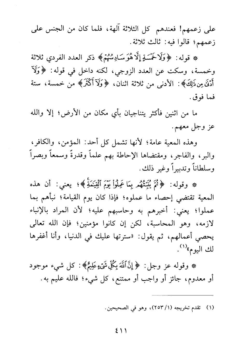 قوله: {وَلا خَمْسَةٍ إِلاّ هُوَ سَادِسُهُمْ} ذكر العدد الفردي ثلاثة وخمسة، وسكت عن العدد الزوجي، لكنه داخل في قوله: {وَلا أَدْنَى مِنْ ذَلِكَ}: الأدنى من ثلاثة أثنان, {وَلا أَكْثَرَ} من خمسة, ستة فما فوق.