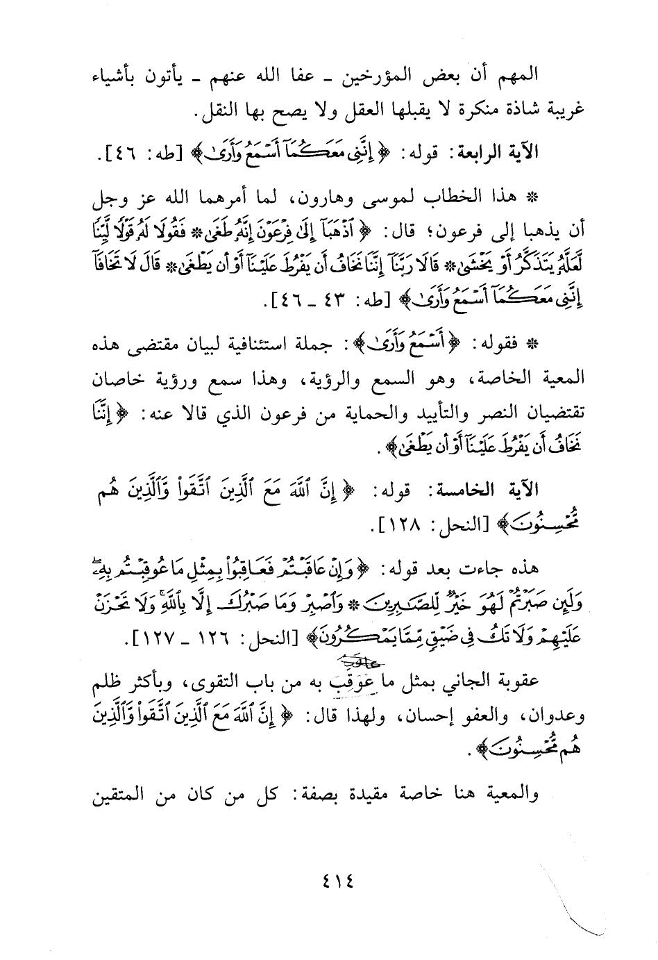الآية الرابعة: قوله: {إِنَّنِي مَعَكُمَا أَسْمَعُ وَأَرَى} [طه: 46].
