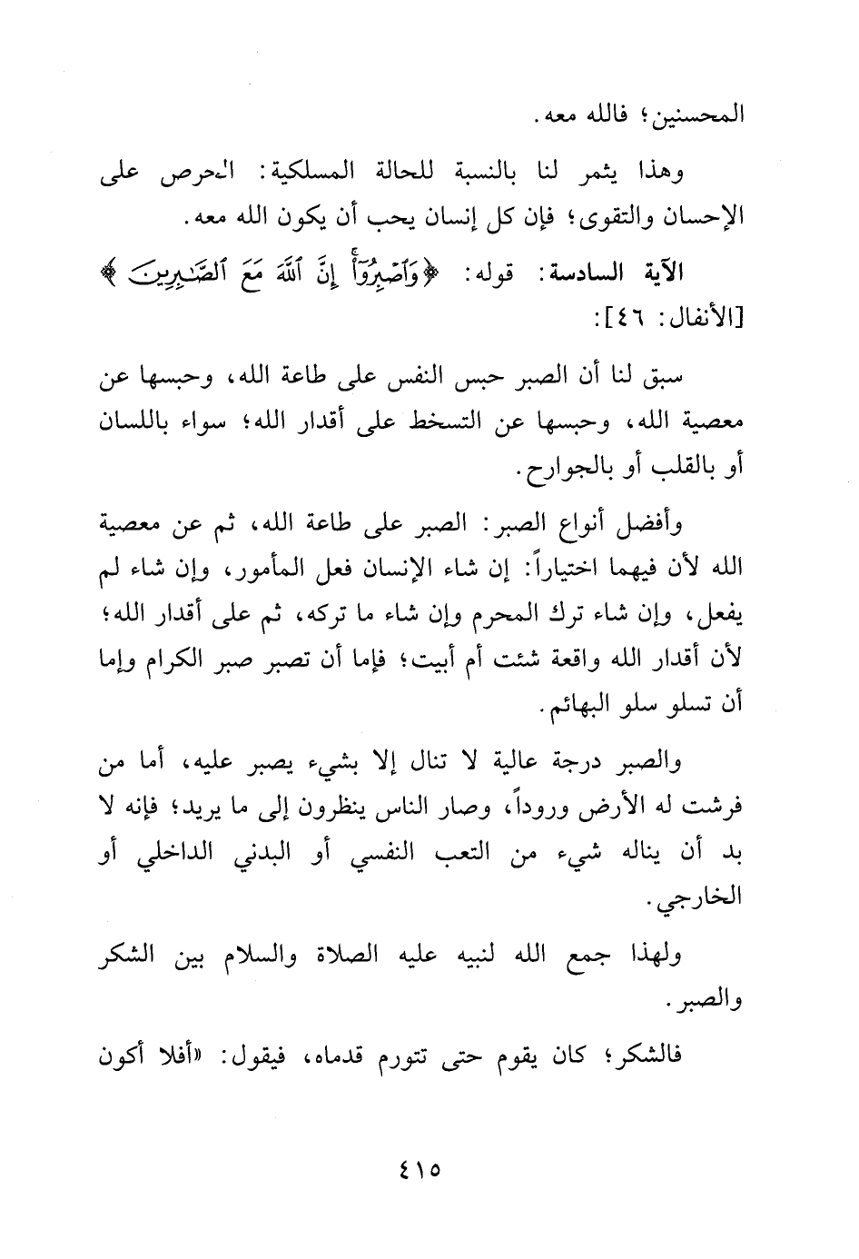 وأفضل أنواع الصبر: الصبر على طاعة الله، ثم عن معصية الله لأن فيهما اختياراً: إن شاء الإنسان فعل المأمور، وإن شاء لم يفعل, وإن شاء ترك المحرم وإن شاء ما تركه, ثم على أقدار الله؛ لن أقدار الله واقعة شئت أم أبيت؛ فإما أن تصبر صبر الكرام وإما أن تسلو سلو البهائم.